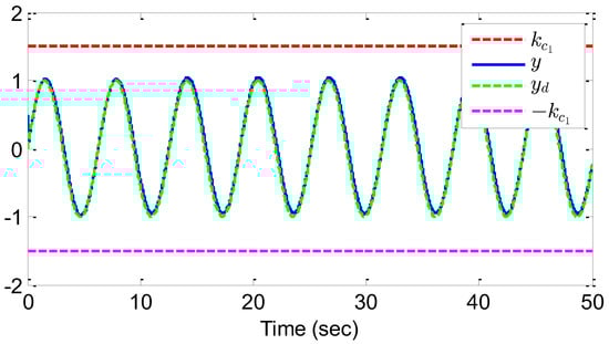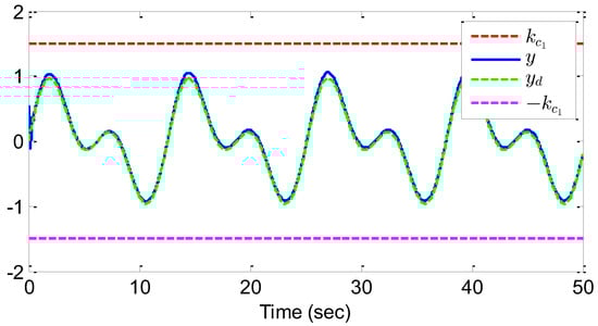 where and are the state variables, with , , y is the system output, and u is the system output. The control objective is for the system output y to track the reference signal .