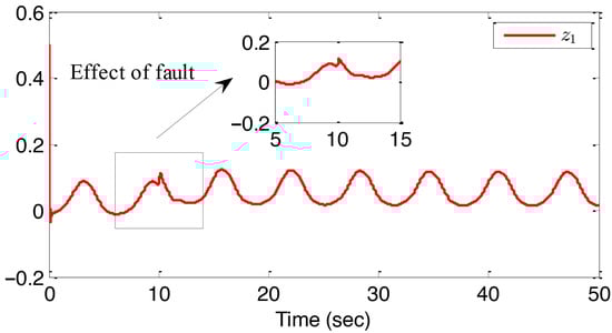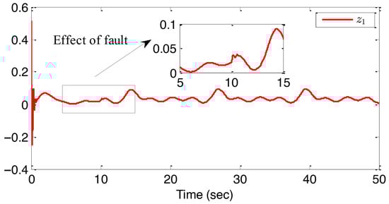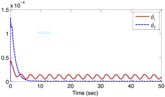 The initial conditions are set as and . The design parameters are , , , , , , , , and . The RBF neural networks are configured as follows: consists of 49 nodes evenly distributed across the interval with a width of 2, while includes 343 nodes uniformly spread over with a width of 2.