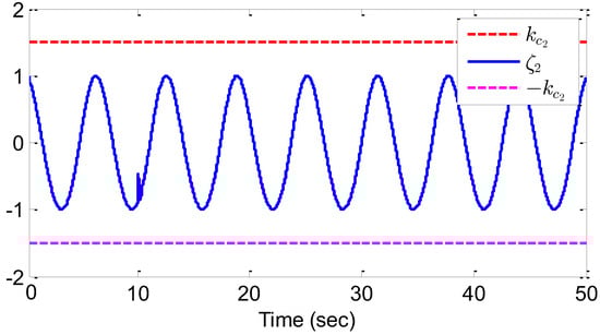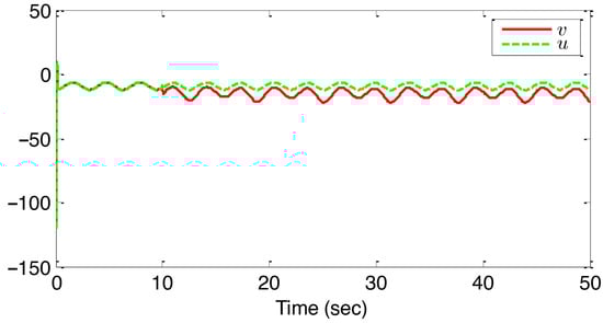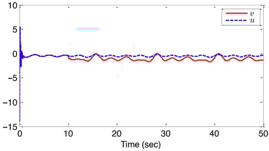 The simulation results, depicted in Figure 7, Figure 8, Figure 9, Figure 10 and Figure 11, highlight several significant findings. Figure 7 illustrates the accurate tracking of the output y with the desired signal within a finite time, ensuring all states remain within their specified limits. Figure 8 presents the tracking error between the output and the reference signal. In Figure 9, the state is shown to adhere to its designated constraints. Figure 10 demonstrates the rapid stabilization of the adaptive parameters and . Finally, Figure 11 provides an overview of the actual control input v alongside the system input u. Together, these figures collectively affirm the effectiveness of the proposed control method in maintaining bounded system variables and achieving convergence in tracking error.