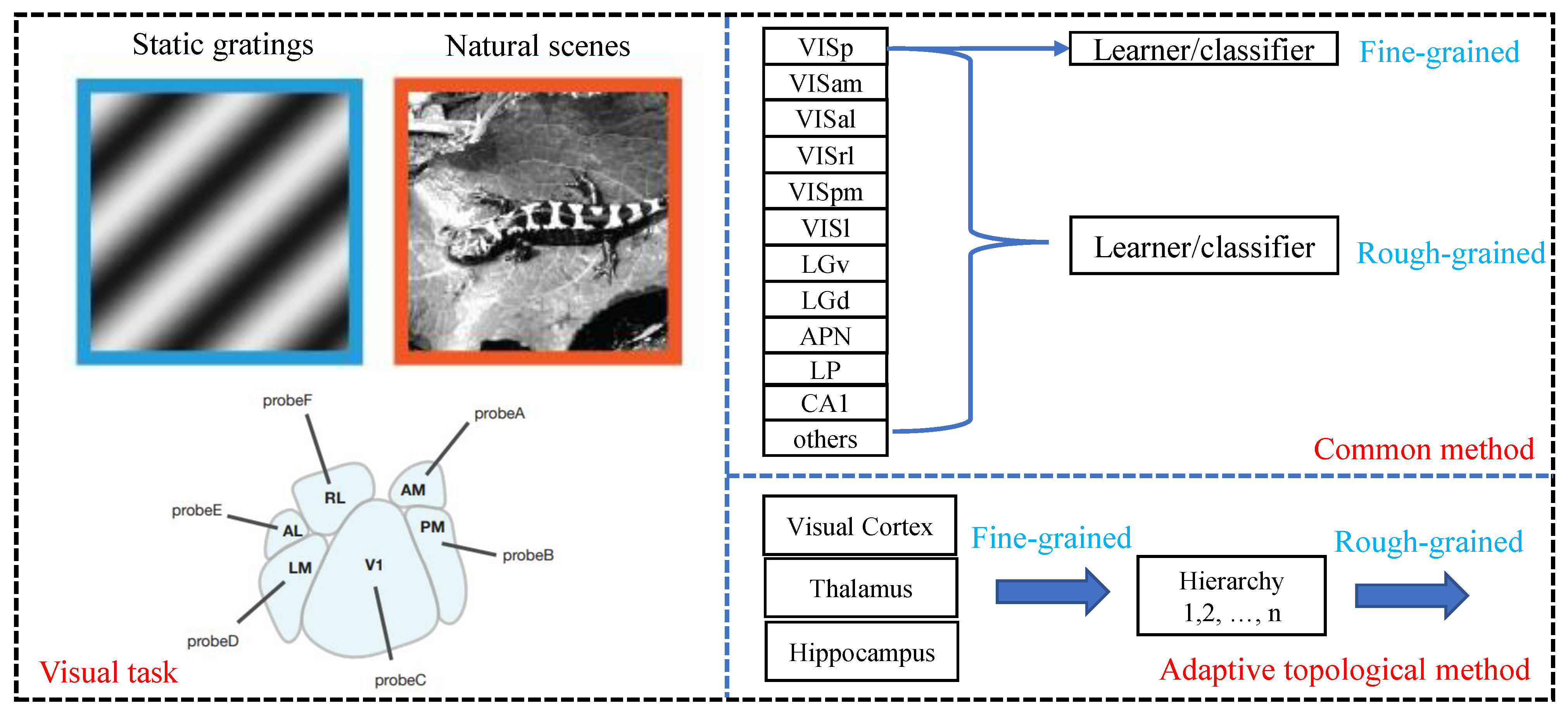 - Siegle, J.; Jia, X.; Durand, S.; Gale, S.; Bennett, C.; Graddis, N.; Heller, G.; Ramirez, T.; Choi, H.; Luviano, J.; et al. Survey of spiking in the mouse visual system reveals functional hierarchy. Nature 2021, 592, 86–92. [Google Scholar] [CrossRef]