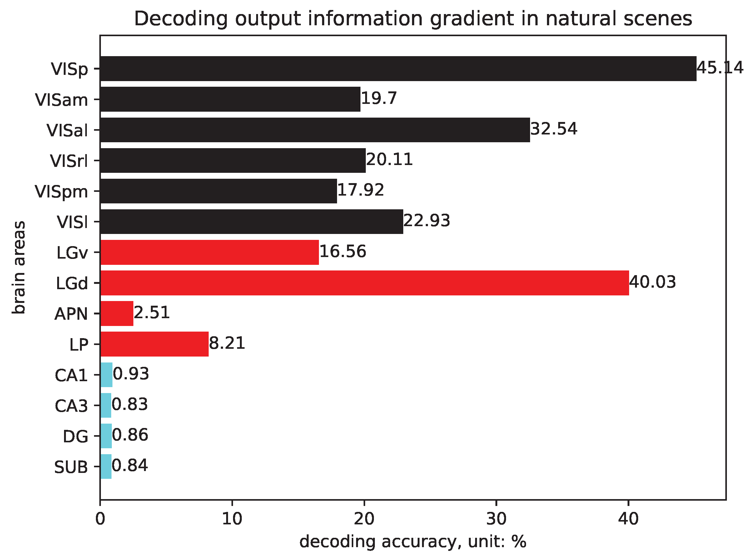 - Compute the normalized information scorewhere is the random baseline, and VISp consistently shows the highest .