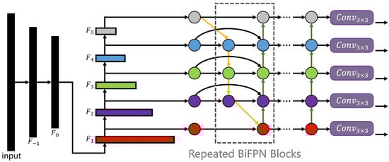 Architecture of the Bi-Directional Feature Pyramid Network (BiFPN), illustrating repeated top-down and bottom-up feature fusion with learnable weighted connections and depthwise separable convolutions for efficient multi-scale representation.