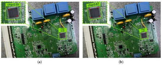 Detection performance comparison between the baseline YOLOv11 and the proposed method. (a) Baseline YOLOv11 result, exhibiting two missed chips and one false detection. (b) The proposed framework, successfully detecting all key chips with no erroneous predictions.