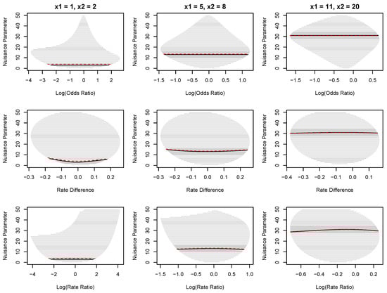 Figure 1 shows three examples for comparing two independent binomial proportions with and , respectively. The numbers of successes are and in the first example, and in the second example, and and in the third example. For the log odds ratio, the profile likelihood estimates of the nuisance parameter are , 13, and 31, respectively, in the three examples and the z-standard intervals are represented by the horizontal bold-faced segments. For the rate difference and log rate ratio, however, the profile likelihood estimates of the nuisance parameter are represented by the bold-faced curves, and the z-standard intervals are the projections of the curves to the horizontal axis. Figure 1 also includes some horizontal grayed segments representing what the z-standard intervals could be if different nuisance parameter values had been specified a priori, where the gray shaded area represents nuisance parameter values that are within one standard deviation of .
