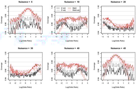 Coverage of the z-standard intervals of the log(OR) with (Z-adj) and without (Z-std) the DF and small-sample corrections () compared to those of the Wald confidence intervals with (Wald-adj) and without (Wald) the small-sample correction () under a nominal level of 0.95. Two independent binomial distributions are used with and at 600 combinations of true log odds ratio and nuisance parameter values. These combinations cover values ranging from −3 to 3 and values at 5, 10, 20, 30, 40, and 45. When or or when or , the Wald confidence intervals for the log(OR) are (, ).