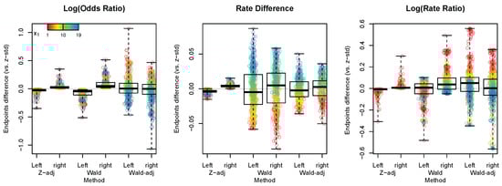 Next, Figure 5 shows the coverage of the four types of confidence intervals for the log(RR) at 600 combinations of true log rate ratio and nuisance parameter values and the right plot in Figure 3 shows a comparison of their endpoints. These combinations cover values ranging from −4.5985 to 5.0006 and values at 5, 10, 20, 30, 40, and 45. This setting also faces an issue that not all values are permissible. Figure 5 shows that the coverage of all confidence intervals may change drastically when is far away from 0. In these cases, the small-sample corrected Wald confidence intervals performed even worse than their original counterparts, and even the z-standard intervals with or without the corrections may fail. These results suggest that inference for the RR may not be the best choice in certain situations where extreme parameter values are expected. This may be because of the asymmetrical nature of RR and the effect of small denominators.