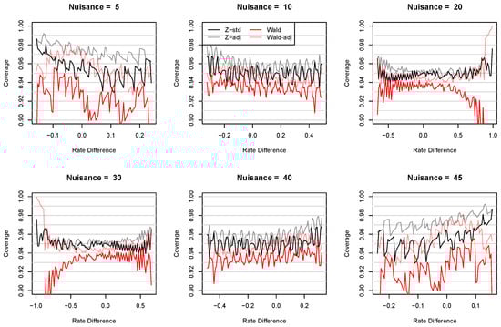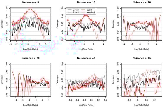 Coverage of the z-standard intervals of the log(RR) with (Z-adj) and without (Z-std) the DF and small-sample corrections () compared to those of the Wald confidence intervals with (Wald-adj) and without (Wald) the small sample correction () under a nominal level of 0.95. Two independent binomial distributions were used with and at 600 combinations of true log rate ratio and nuisance parameter values. These combinations cover values ranging from −4.5985 to 5.0006 and values at 5, 10, 20, 30, 40, and 45. When or , Wald confidence intervals for the log(RR) are (, ).