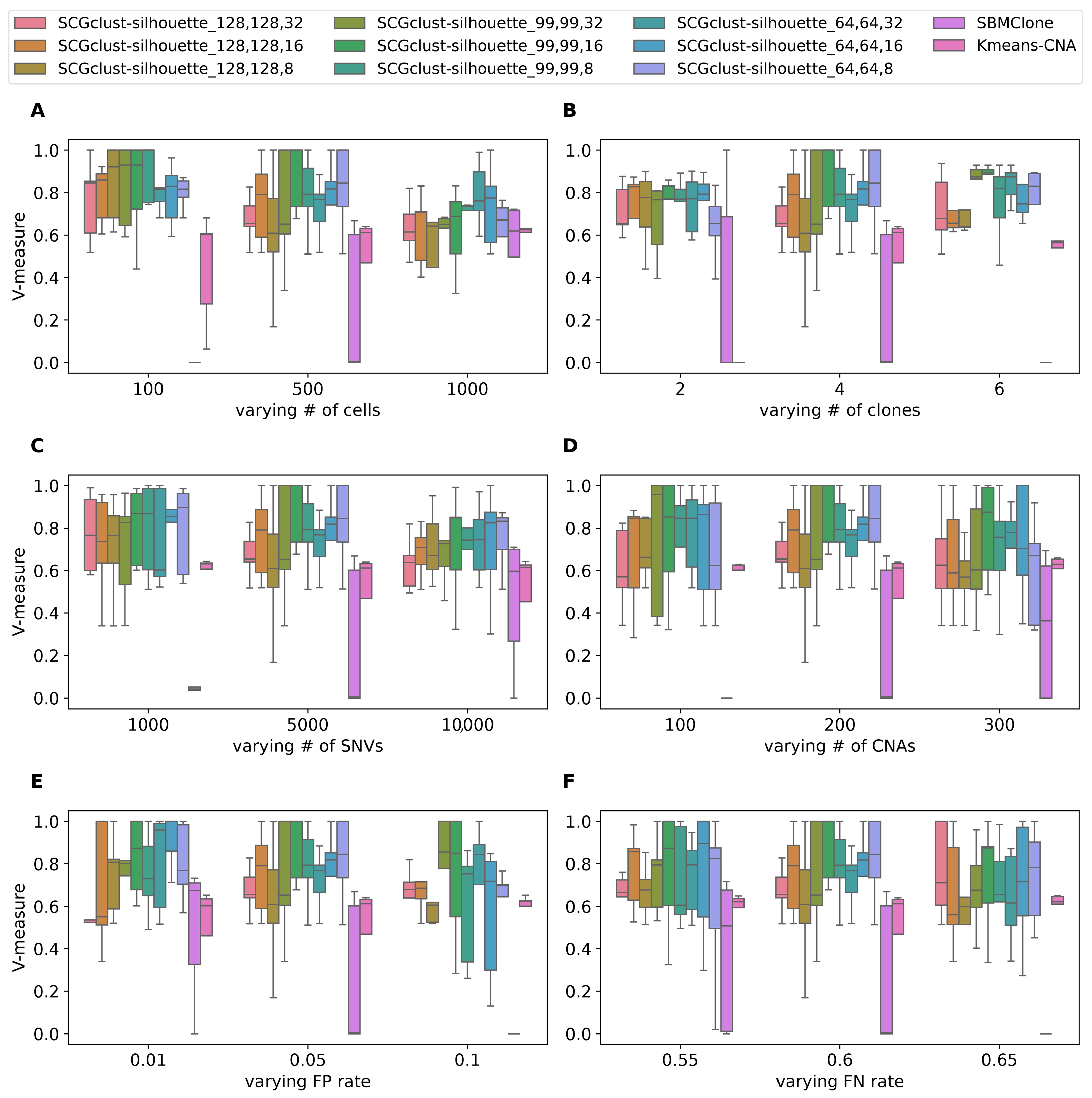 Figure 2. Boxplots are shown for the V-measure for SCGclust using the silhouette score to select the best epoch (SCGclust-silhouette, in blue), SCGclust using ground truth clustering to select the best epoch as a reference (SCGclust-GT, in orange), SBMClone (SBMClone, in green), and a K-means method that uses the read count, which is a CNA signal, to cluster the cells (Kmeans-CNA, in red). Eight variables were varied to study the performance of these four methods, including (A). the number of cells, (B). the number of clones, (C). the number of SNVs, (D). the number of CNAs on the top panel, (E). the FP rate, (F). the FN rate, (G). the missing rate, and (H). the CNA noise on the bottom panel. The median of each boxplot is highlighted with a black horizontal line. Each set of variables was repeated five times to avoid extreme cases.