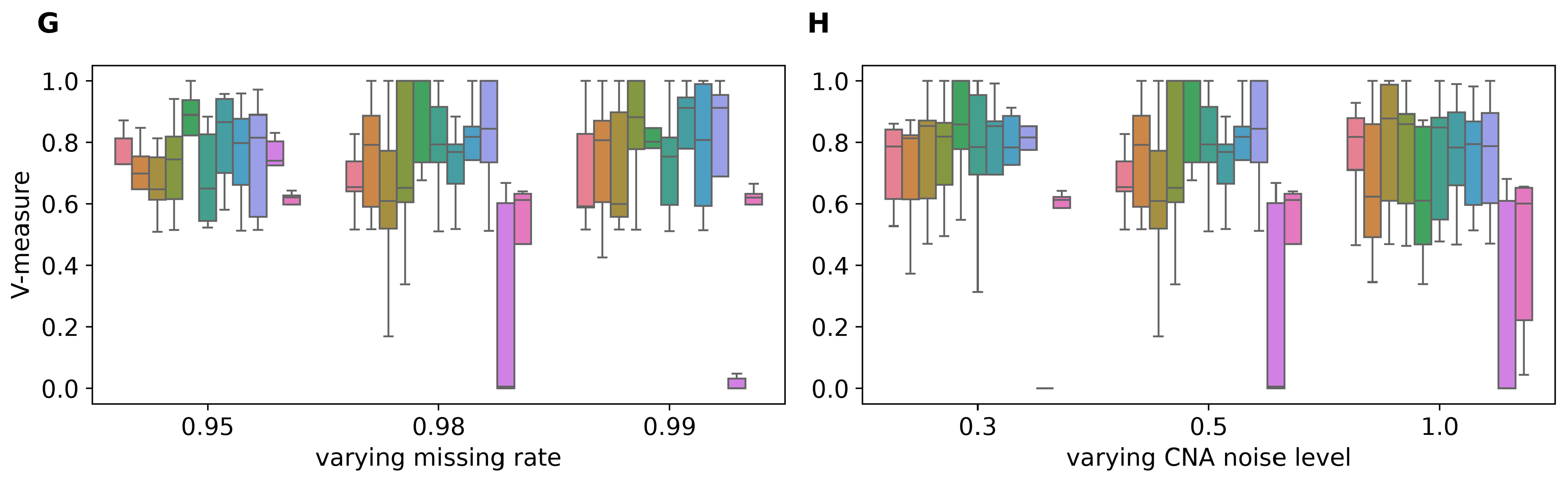 We plotted the V-measures of these four methods, as shown in Figure 2. The V-measure is a metric that quantitatively measures the clustering result. It assesses the balance between homogeneity and completeness, in which homogeneity measures how much each inferred cluster contains only the cells in a single true subclone, and completeness measures how well all members of a true subclone are assigned to the same inferred cluster. Mathematically, let C be a vector of the true class labels for each cell, and K be the cluster assignment by the algorithm. The homogeneity h can be represented as h = 1 H ( C | K ) H ( C ) , in which H(C|K) is the conditional entropy of the cluster distribution given the cluster assignment by the algorithm, and H(C) is the entropy of the class distribution. The completeness c can be represented as c = 1 H ( K | C ) H ( K ) , in which H(K|C) is the conditional entropy of the cluster assignment given the true class labels, and H(K) is the entropy of the cluster assignment by the algorithm. The V-measure is then a harmonic mean of h and c. We chose the V-measure as the primary metric of measuring the clustering accuracy because it balances both the homogeneity and completeness. A high V-measure is only achieved if both are high. This makes it less biased toward over-segmentation (which can inflate homogeneity) or over-merging (which can inflate completeness), and it is symmetric, which means that swapping labels of clusters or classes does not change the score. This symmetry and balance make it especially useful when the true labels are known and a fair assessment of the clustering quality is desired. The V-measure ranges from 0 to 1, where a score of 1 indicates perfect clustering and 0 indicates poor clustering. As a reference, we also tested two other widely used metrics: the adjusted random index (ARI) and normalized mutual information (NMI), the results of which are shown in Supplemental Figures S2 and S3. We observed that these three metrics rendered a very similar trend for all the methods being tested. Due to the fact that the V-measure balances both homogeneity and completeness, we chose the V-measure as the measurement metric for the clustering accuracy by default when ground truth labels were available.