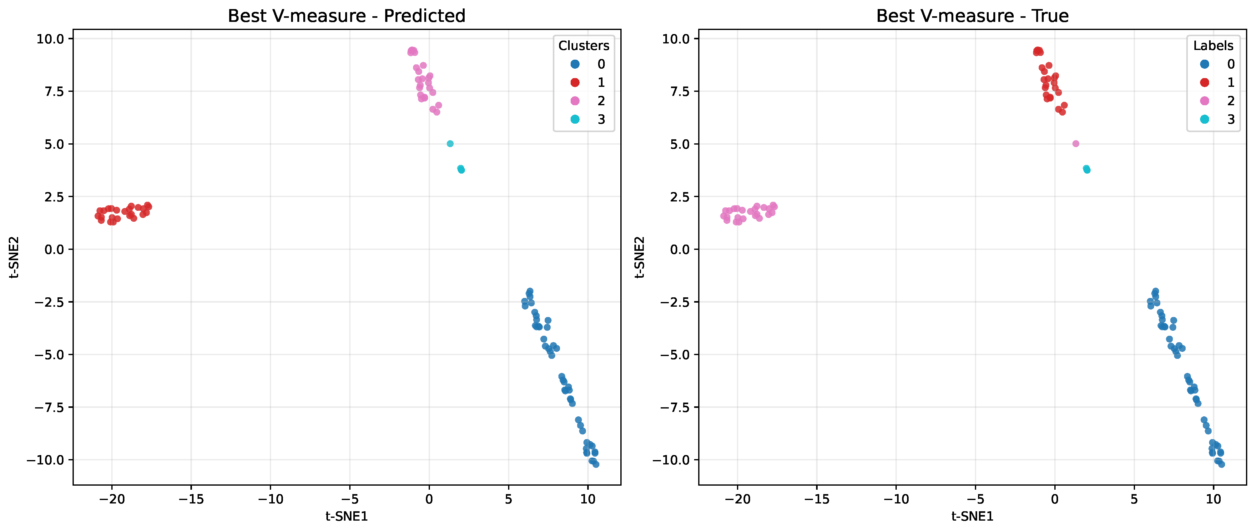 Figure 5. t-SNE plots of the latent space from SCCGclust on dataset T10, showing predicted subclones (left) and ground truth subclones (right).