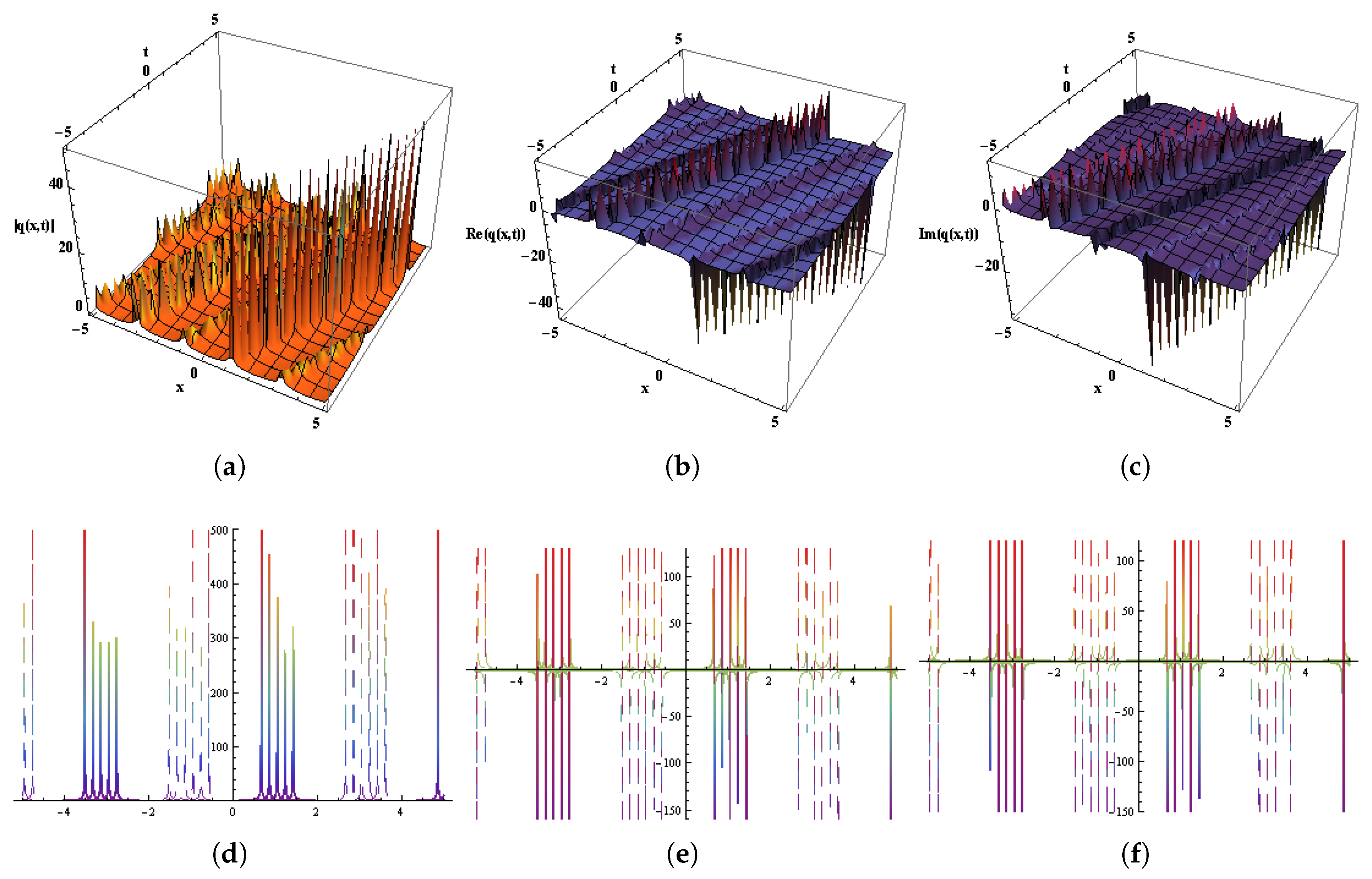 - Ahmed, I.; Seadawy, A.R.; Lu, D. Kinky breathers, W-shaped and multi-peak solitons interaction in (2+ 1)-dimensional nonlinear Schrödinger equation with Kerr law of nonlinearity. Eur. Phys. J. Plus 2019, 134, 120. [Google Scholar] [CrossRef]