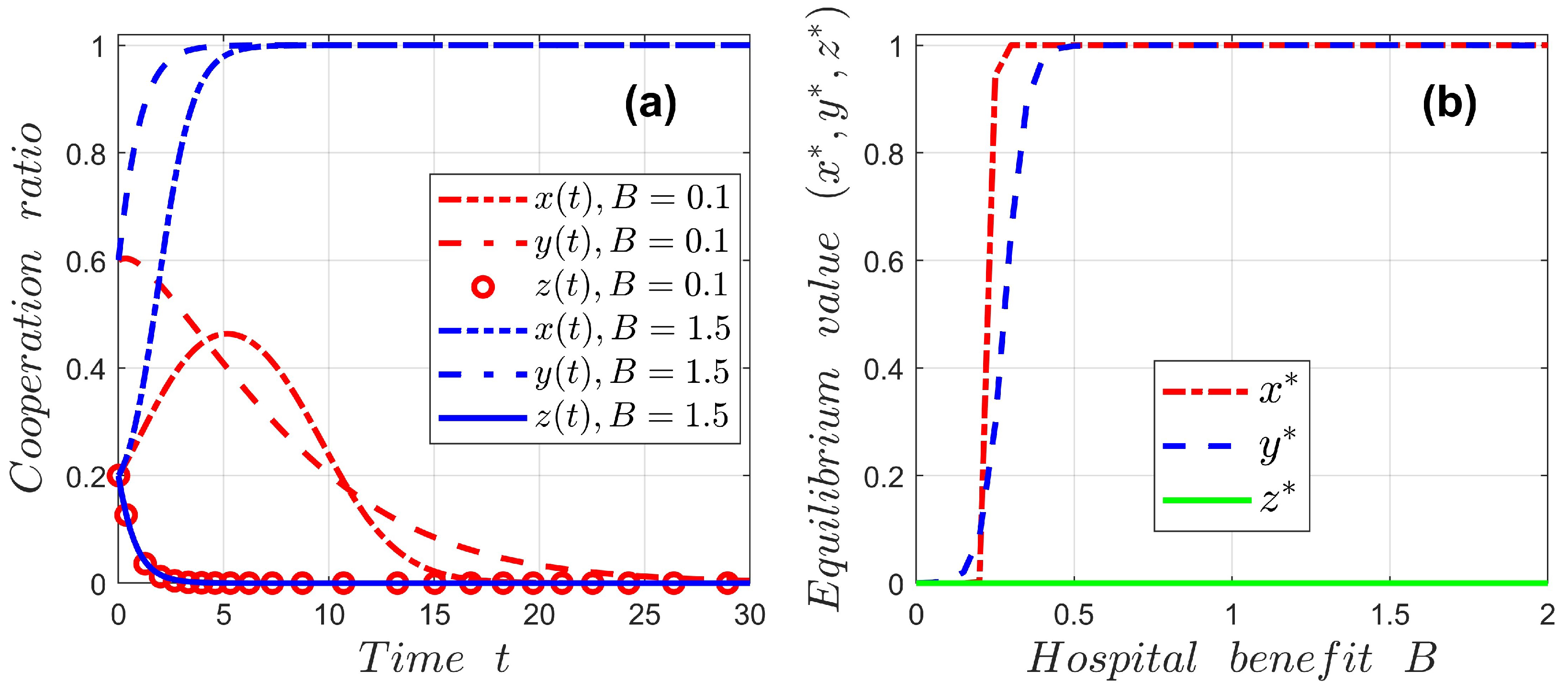 Although the present model is theoretical, many parameters can be estimated or calibrated empirically using existing procurement and hospital operation data. Hospital-side benefits represented by B may be inferred from procurement savings or reimbursement adjustments. Supplier-related parameters such as H and can be estimated from historical records of bad debt and audited production or logistics costs. GPO-related benefits such as S and may be linked to administrative performance metrics or policy subsidy information. In addition, the transition rates embedded in the replicator dynamics can be calibrated from behavioral data reflecting participation frequency, compliance behavior, and changes in procurement volume. Incorporating empirical calibration in future work would allow the model to serve as a practical component of real decision-support systems and further enhance its policy relevance.