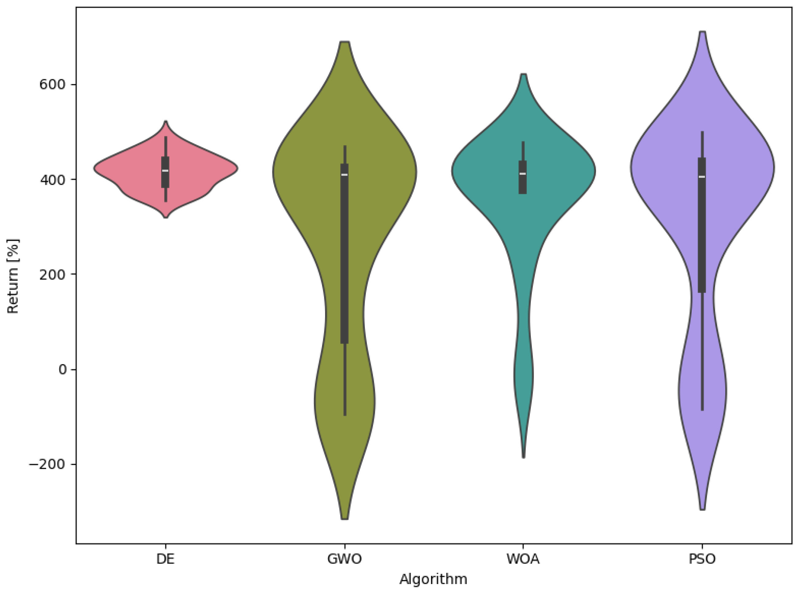 | Metaheuristic | Avg. Return (ann.) [%] | Avg. Volatility (ann.) [%] | Best Return (ann.) [%] | Volatility of Best (ann.) [%] |