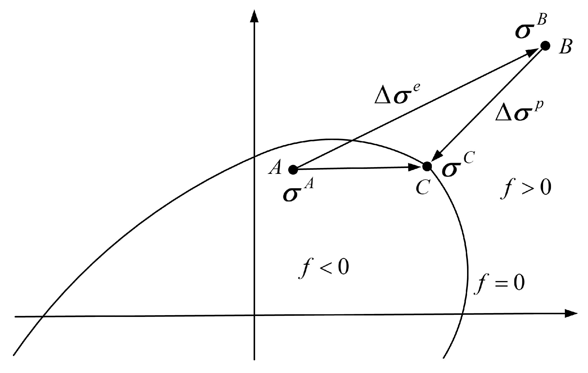 (1) Set initial value: Before starting the iteration, the initial stress value is the initial elastic trial stress σ B , and the plastic parameter Δ λ is set to 0. Then, we have