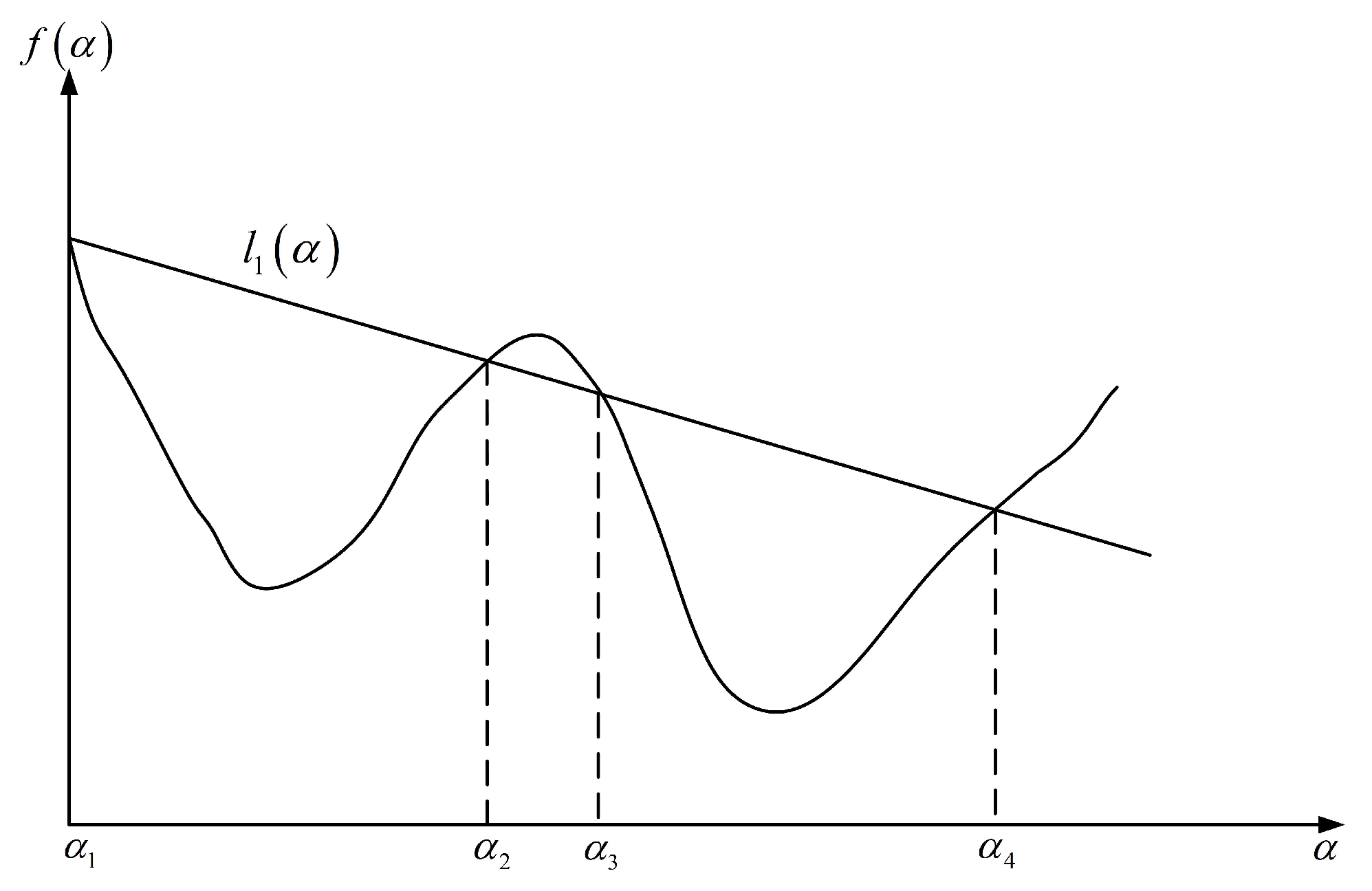 where f x k is the objective function, d k is the descent direction, α is the step size, and c is a dimensionless parameter and is usually set to 10 4 . From Figure 2, if the step size α is set within α 1 , α 2 and α 3 , α 4 , the function value will decrease.