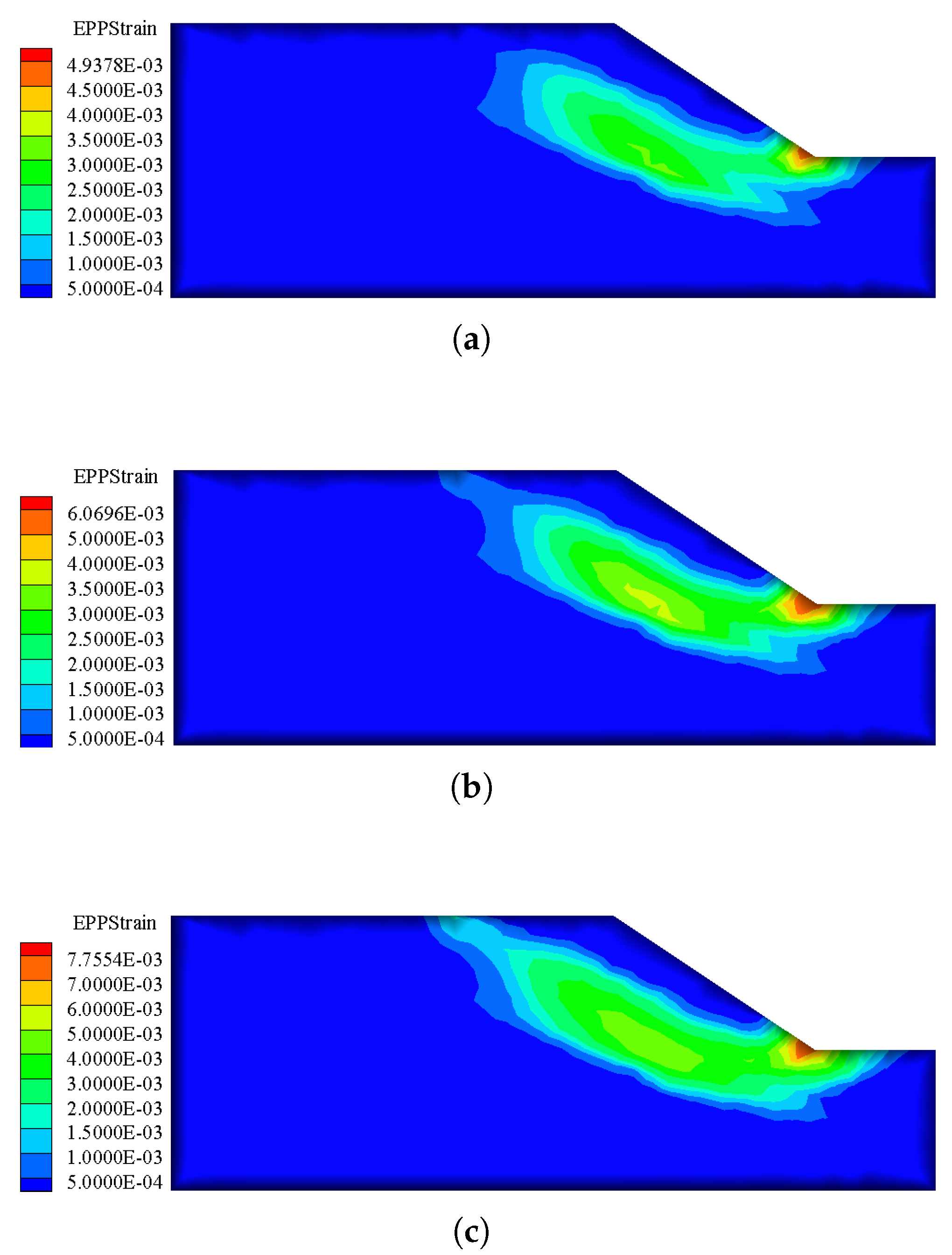 Figure 6. Counter of the equivalent plastic zone under different reduction factors: (a) 0.42, (b) 0.43, (c) 0.44.