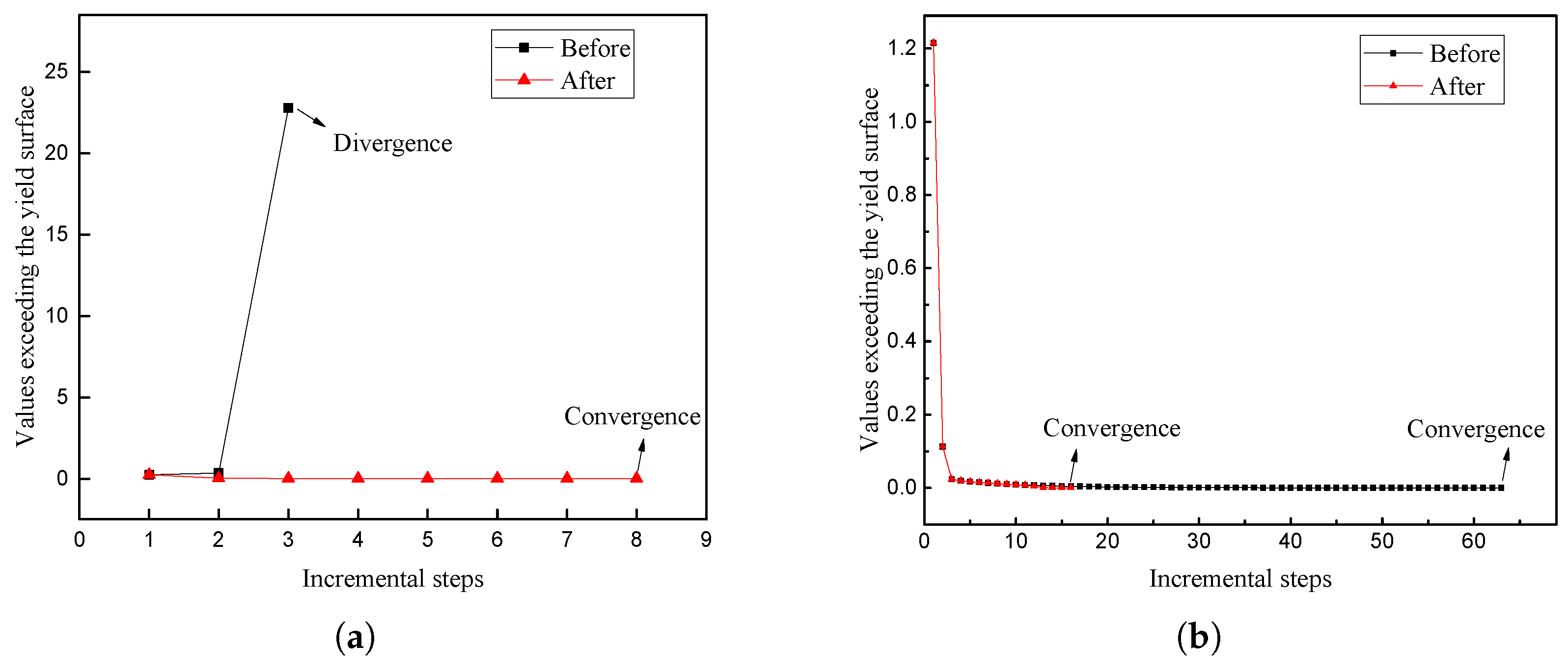However, the iterative process encounters a convergence problem; even for the ideal elastoplastic model, convergence problems may occur in high curvature regions of the yield surface [18]. To enhance the convergence of plastic correction, this paper employs the line search method and adaptive sub-step method.