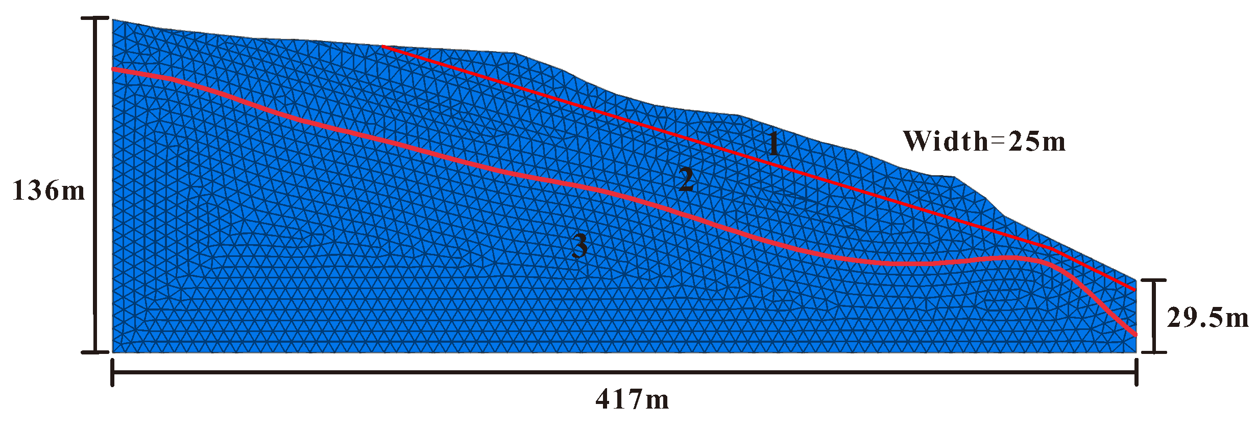 Figure 4. Geometry and mesh model of the heterogeneous slope.