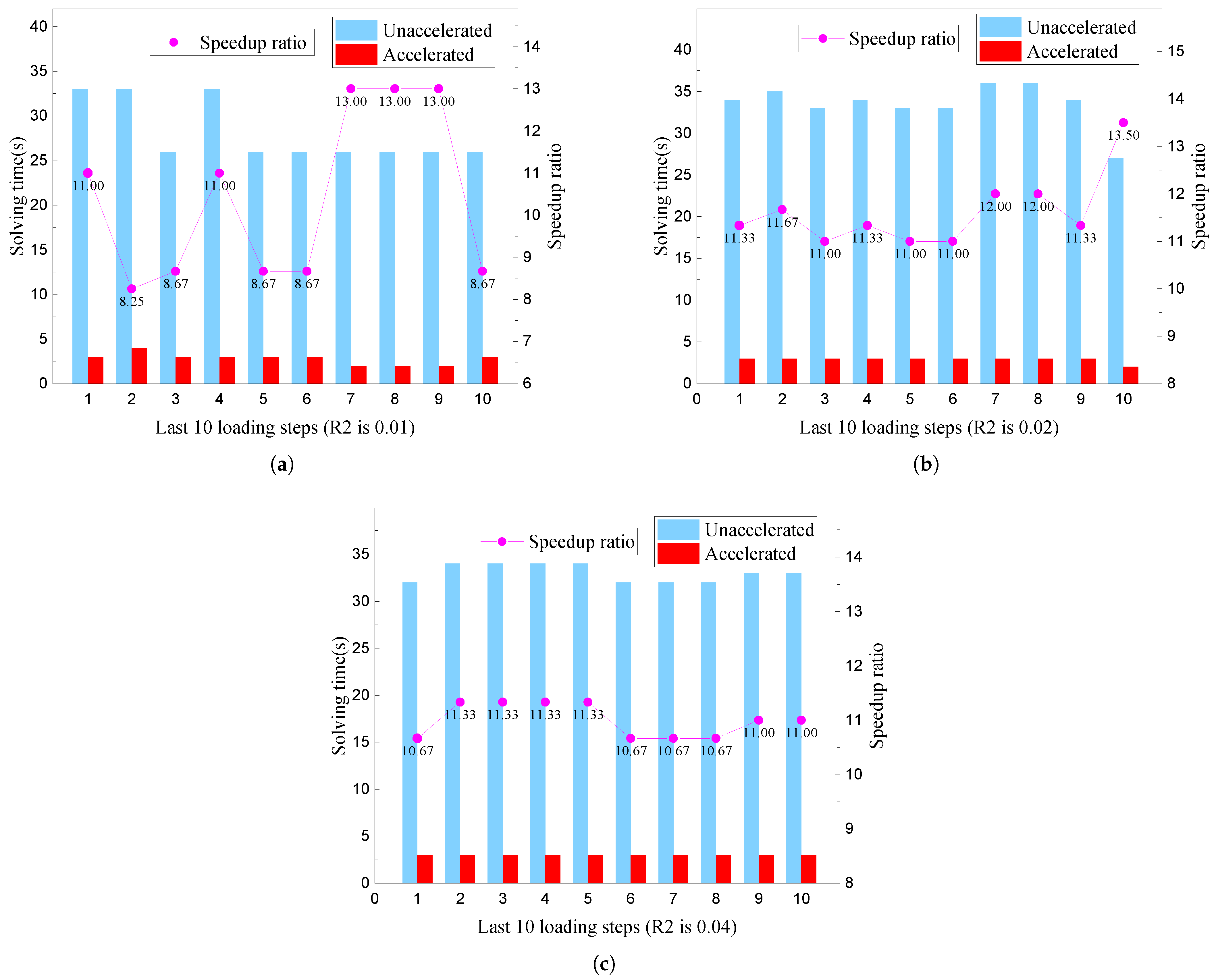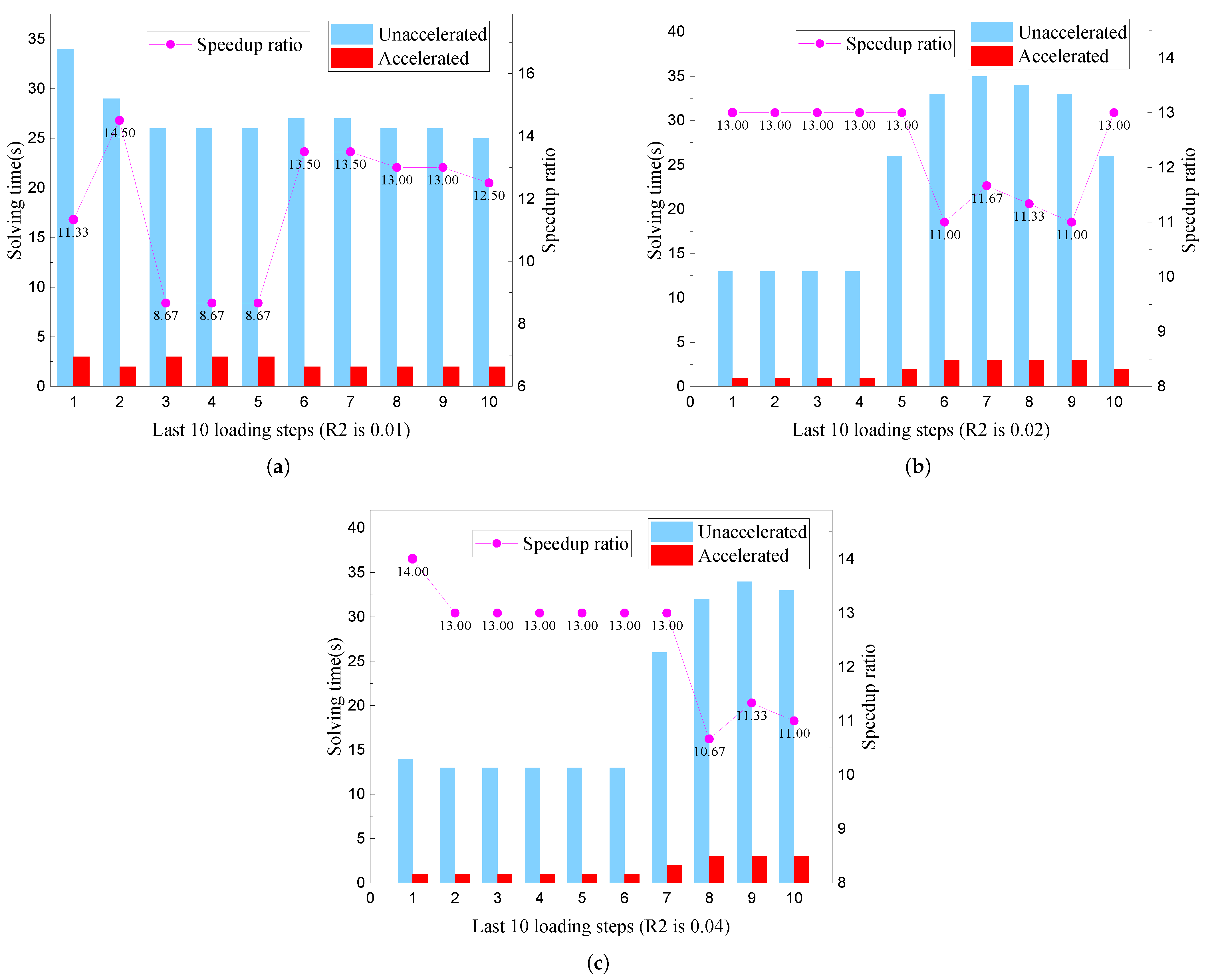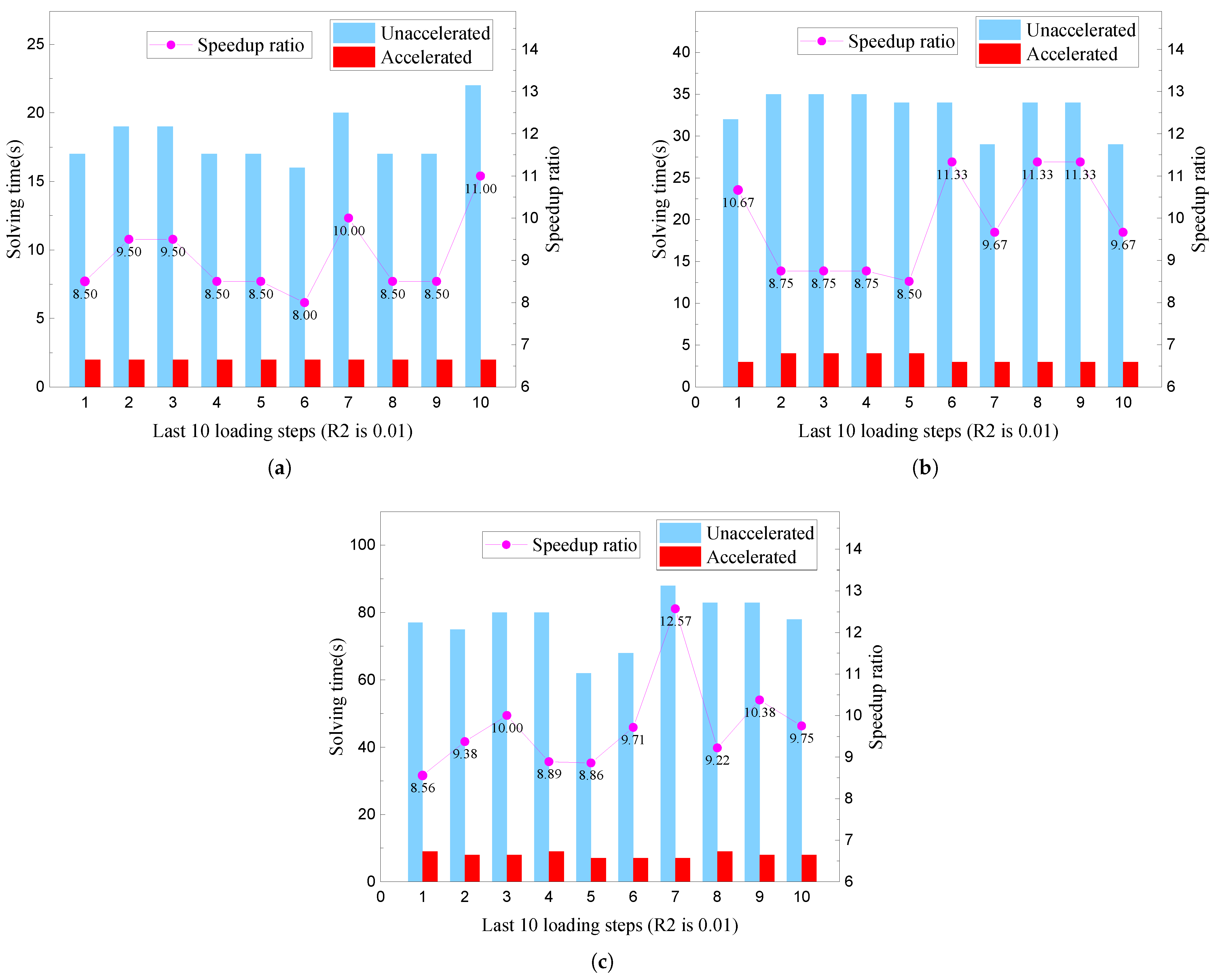 Figure 12. Solving time and speedup ratio of the last 10 loading steps when the reduction factor is 1.30: (a) R2 is 0.01, (b) R2 is 0.02, (c) R2 is 0.04.