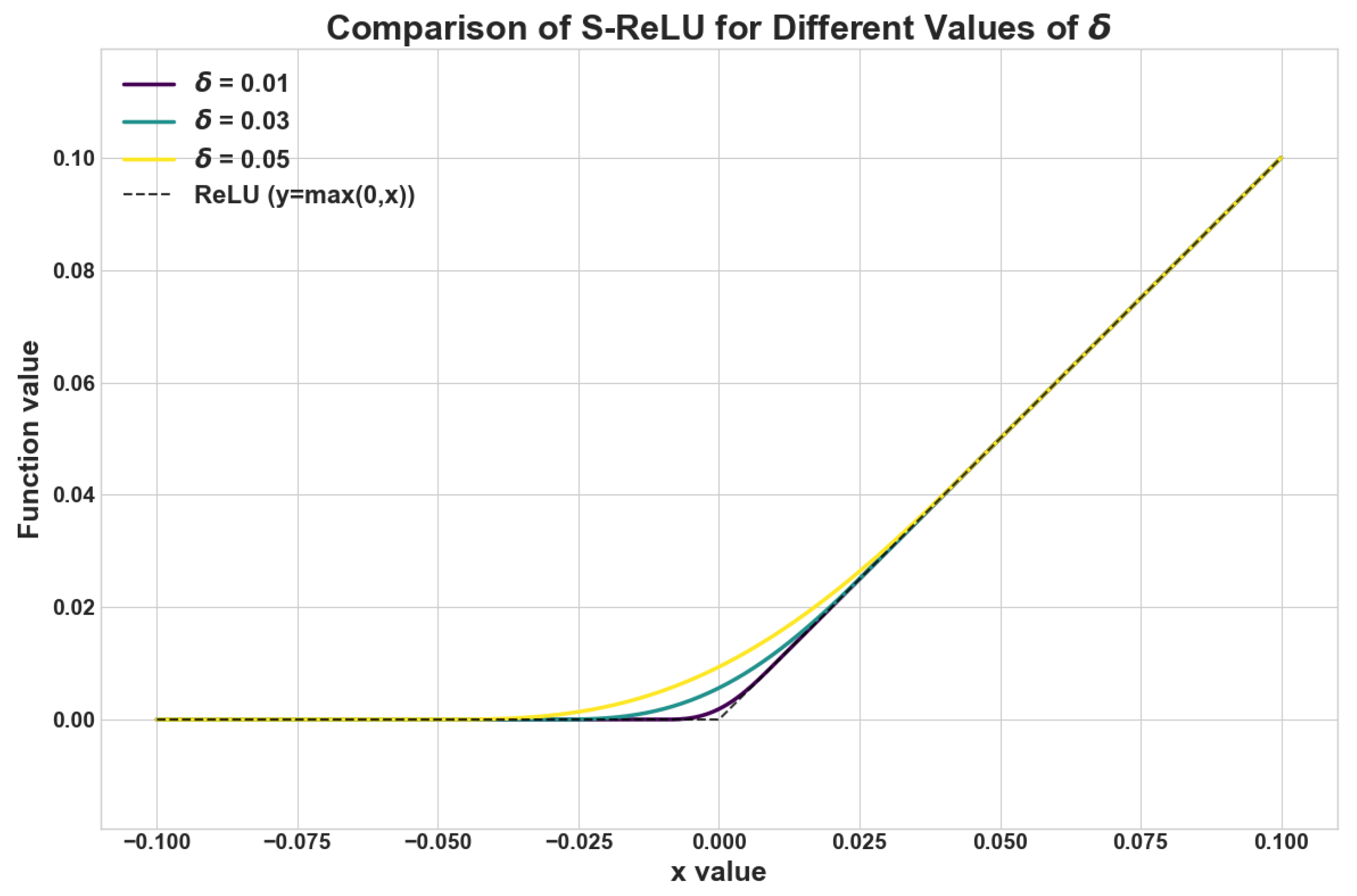 . This ensures that the smoothing effect is strictly local—S-ReLU is exactly linear (preserving ReLU’s properties) outside this interval. Gaussian smoothing, with its infinite support, asymptotically alters the function over the entire domain, theoretically sacrificing the strict linearity and sparsity of the original ReLU.
