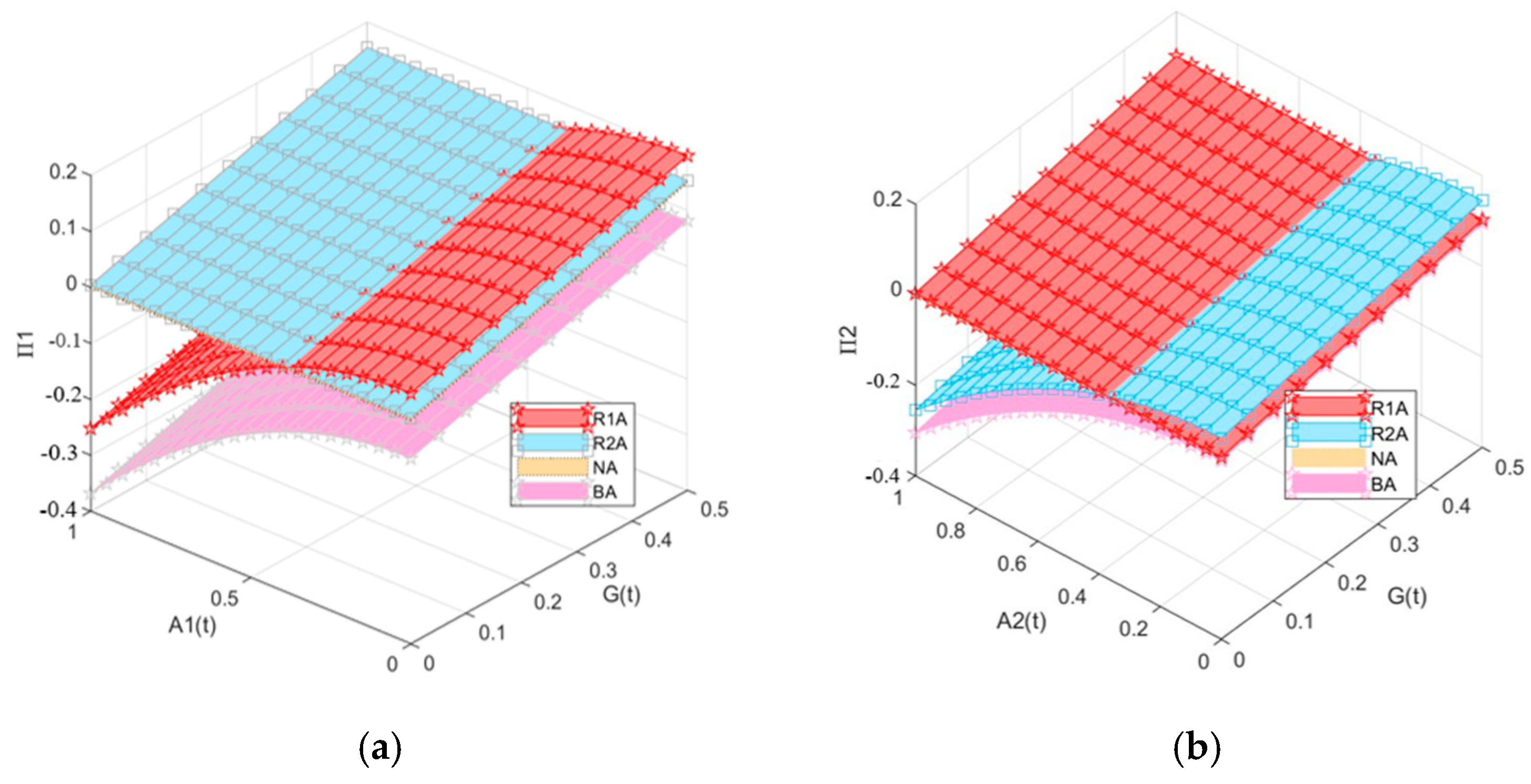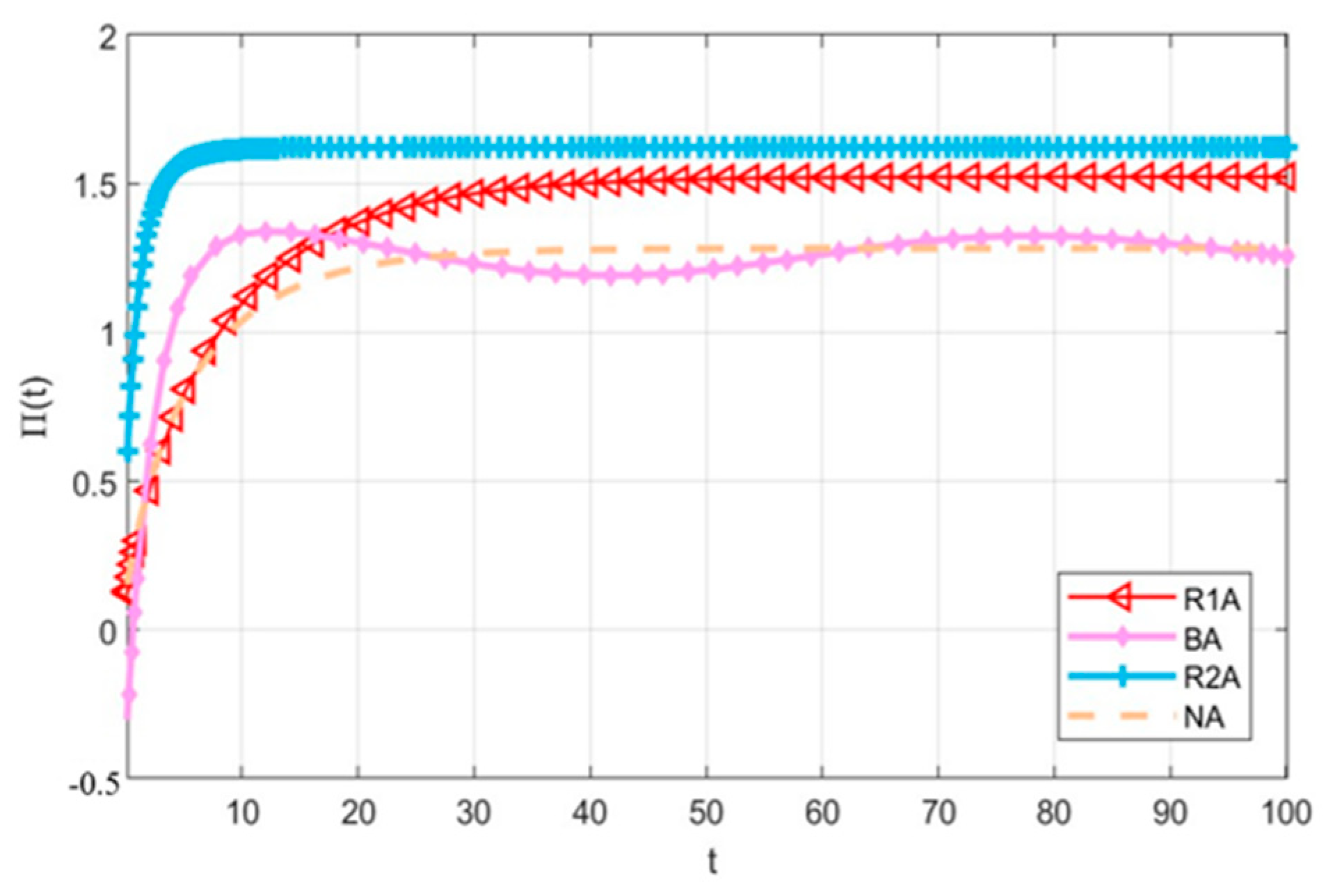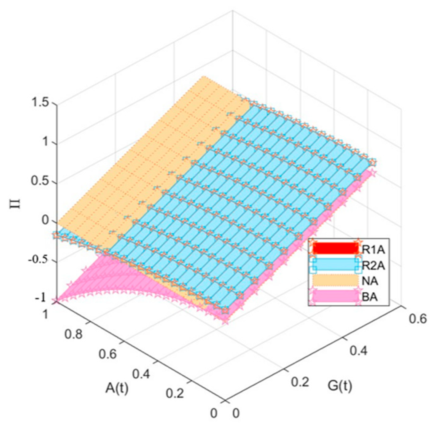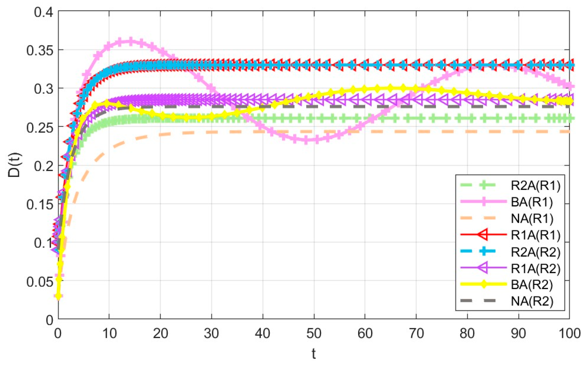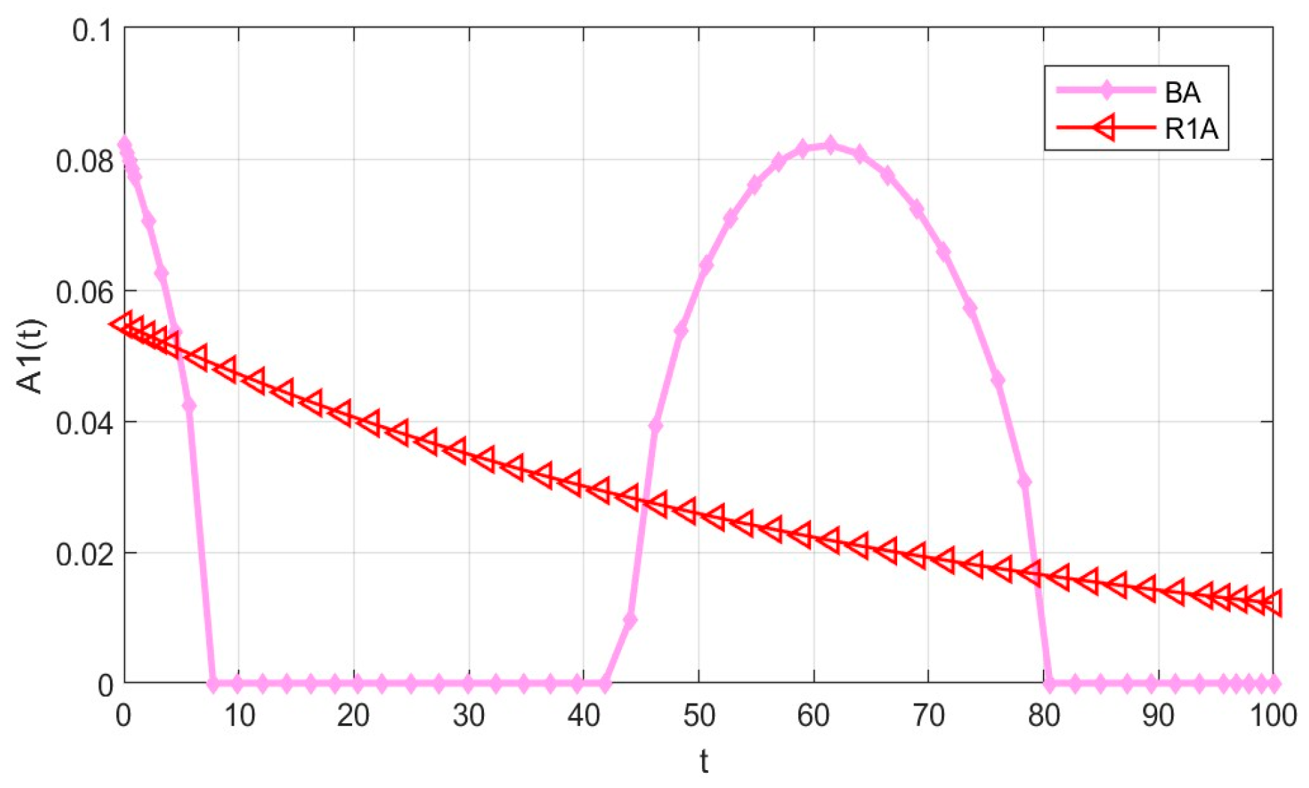 From Equation (A24), it can be seen that when occurs, must be less than 0. At this point, the system is in a steady state, and the advertising market share follows a probability distribution function independent of the initial value. The managerial implication is that when a large amount of advertising is deployed in a secondary supply chain system, the system ceases to be in a steady state. That is, the trend of market share changes becomes beyond the control of the enterprise.