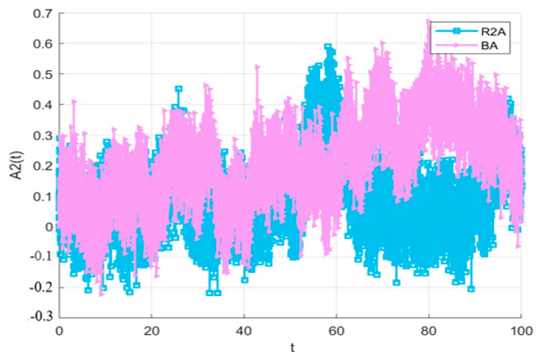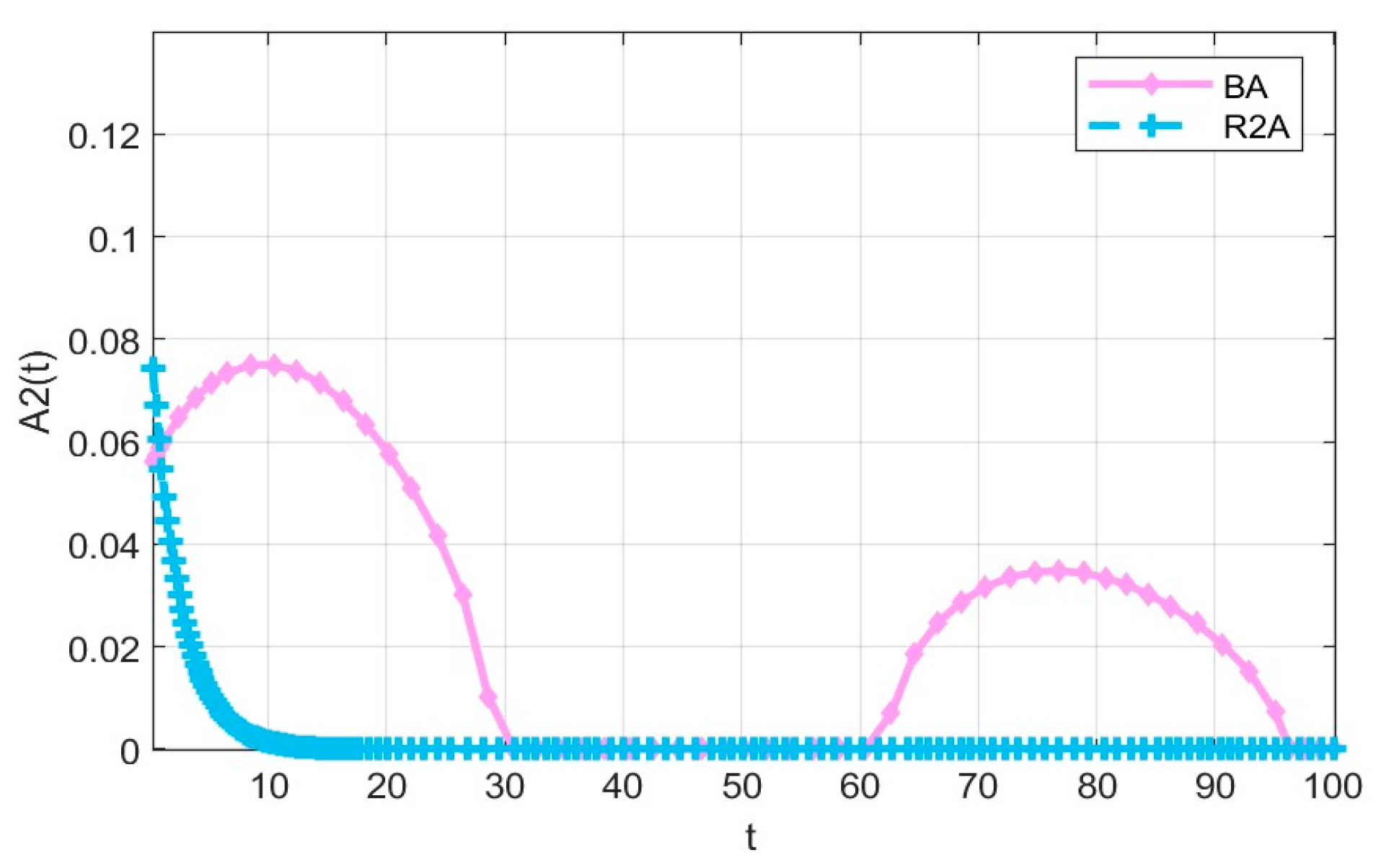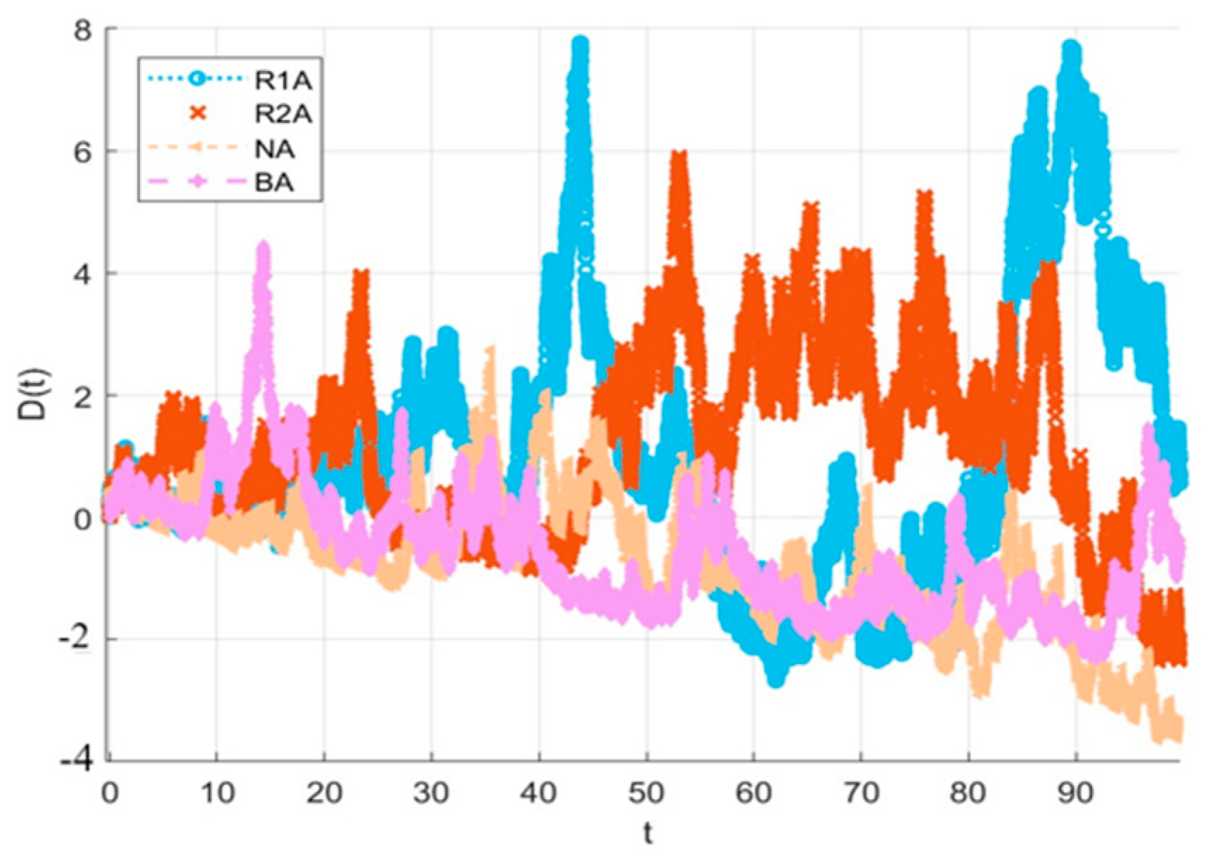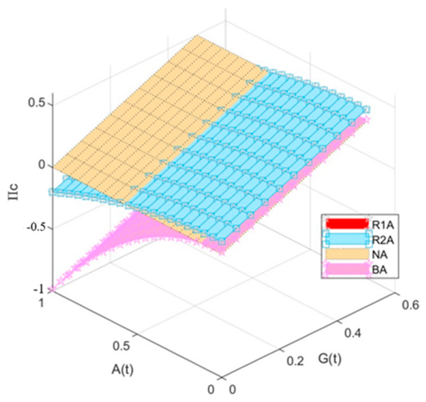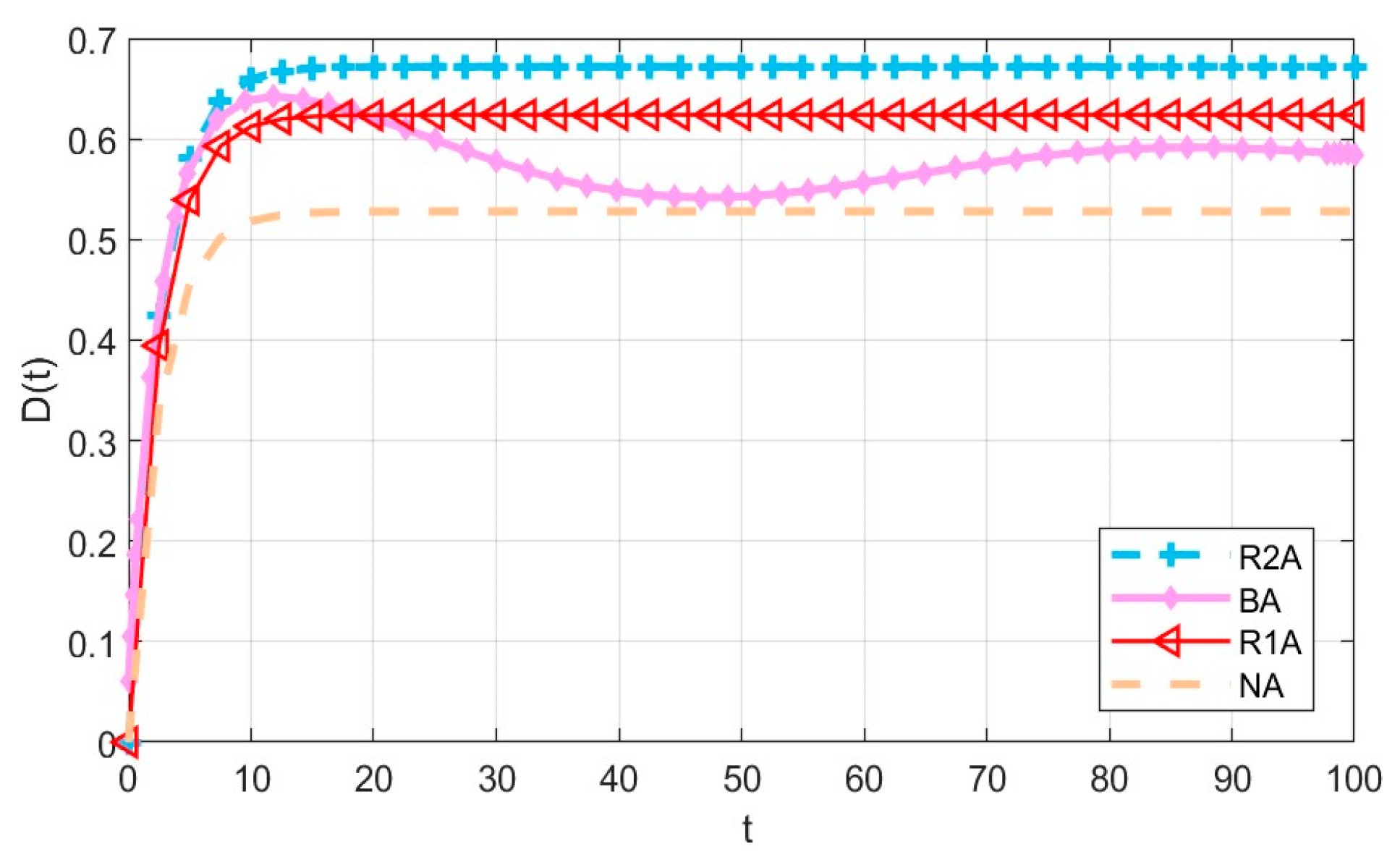 From Equation (A24), it can be seen that when occurs, must be less than 0. At this point, the system is in a steady state, and the advertising market share follows a probability distribution function independent of the initial value. The managerial implication is that when a large amount of advertising is deployed in a secondary supply chain system, the system ceases to be in a steady state. That is, the trend of market share changes becomes beyond the control of the enterprise.
