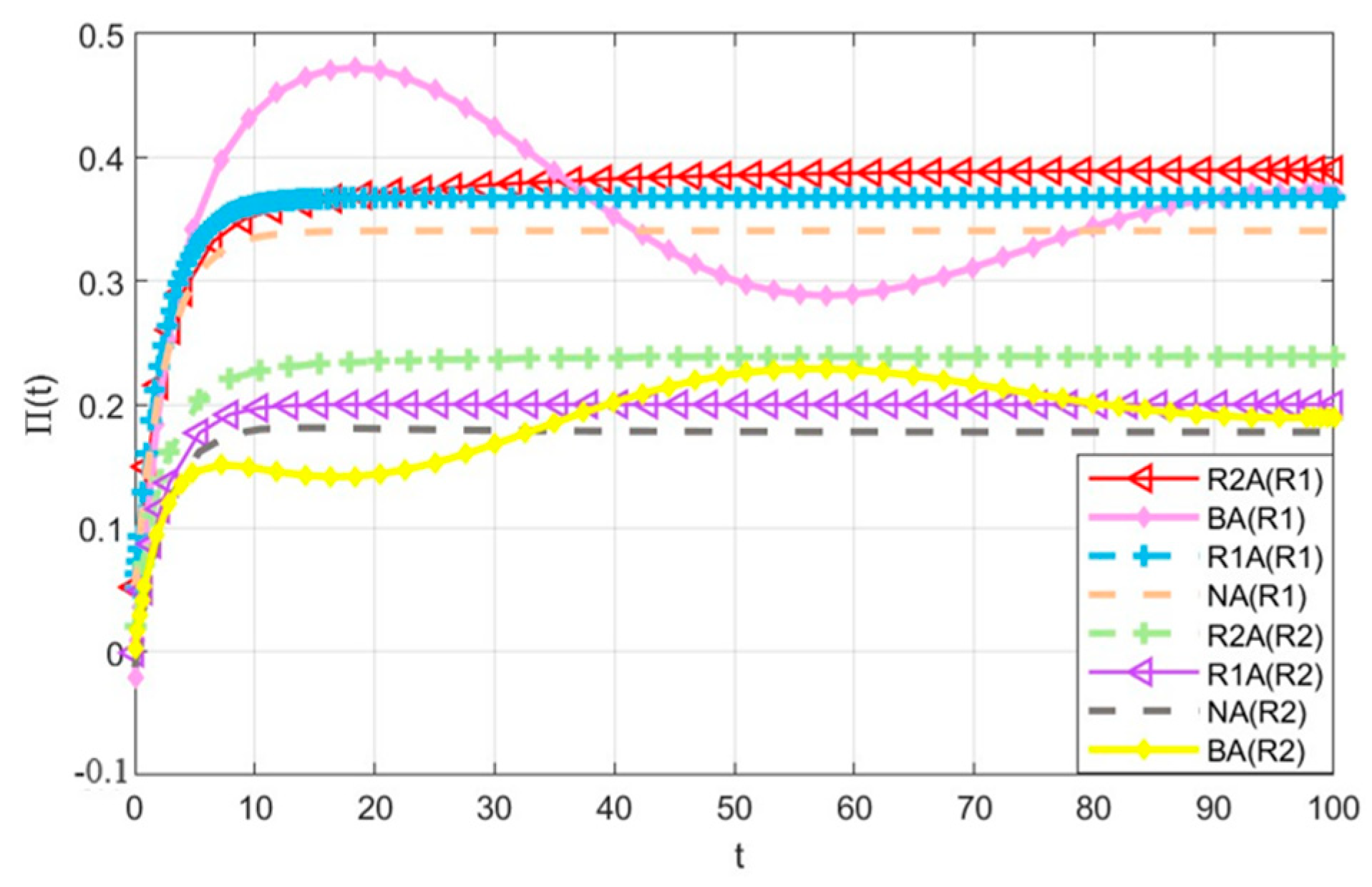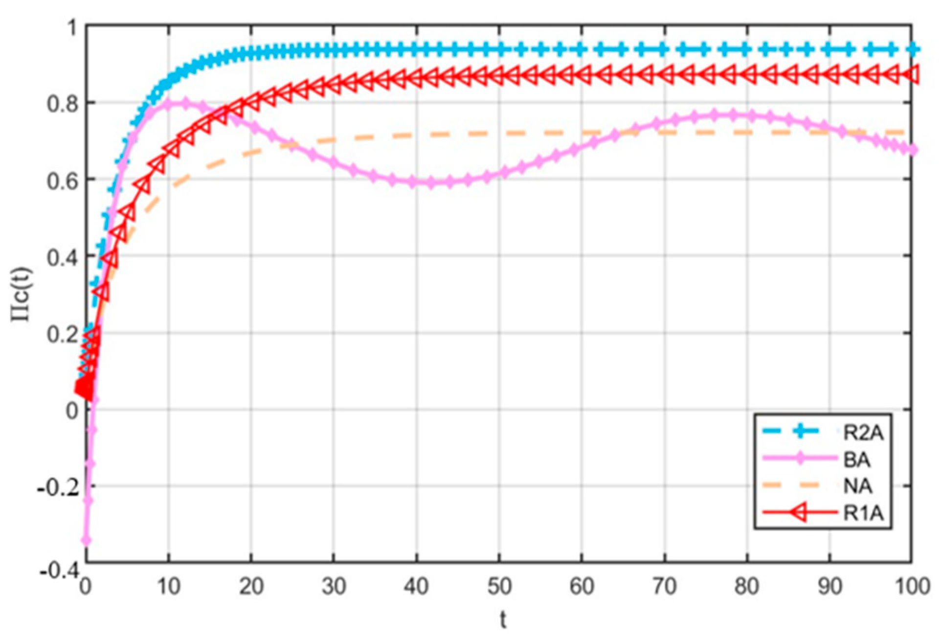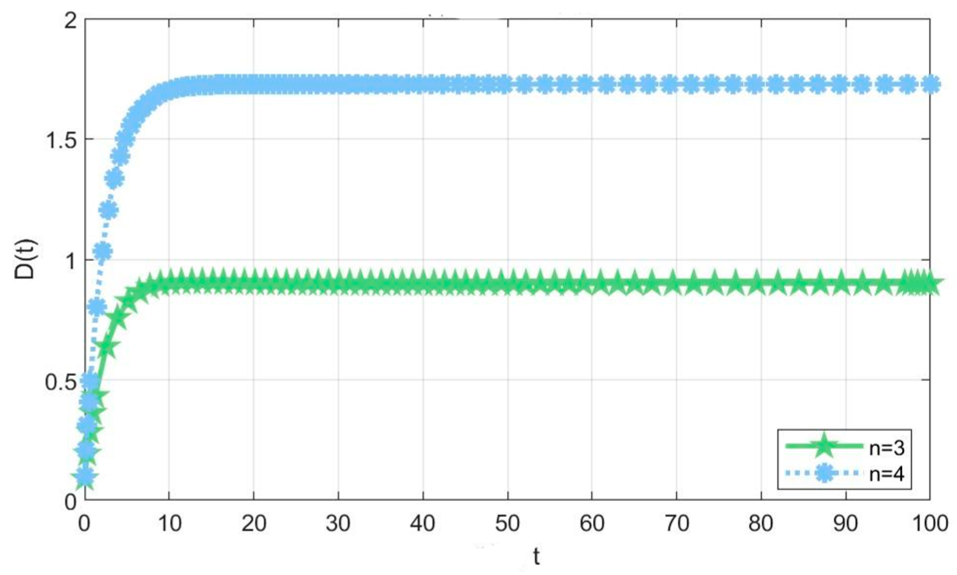 At this point, the system is in a steady state, and the product quality follows a probability distribution function unaffected by initial values. Its managerial implication is that as the investment in big data technology increases within the secondary supply chain system, enterprises become more susceptible to capital constraints and external disturbances. This may cause the system to deviate from its steady state, thereby increasing system volatility and uncertainty, which in turn leads to greater fluctuations in product quality.