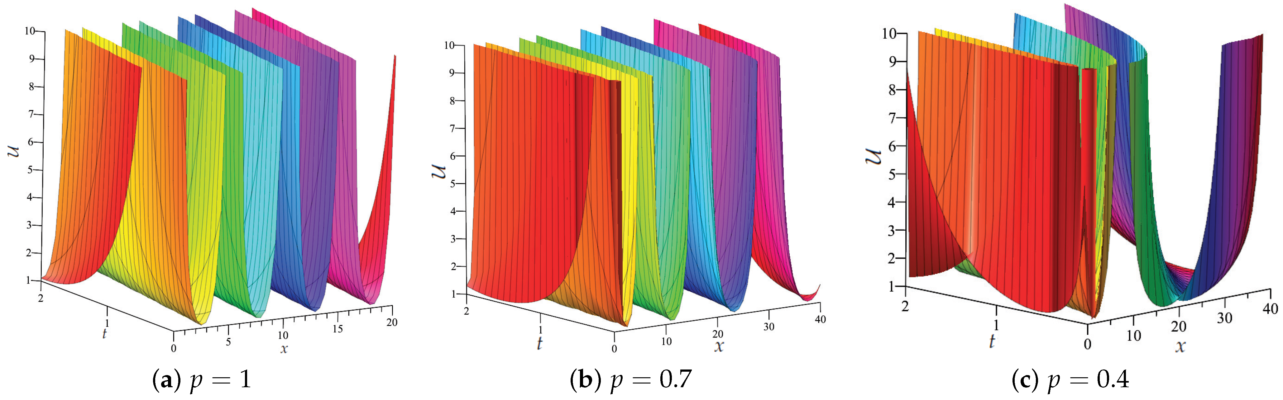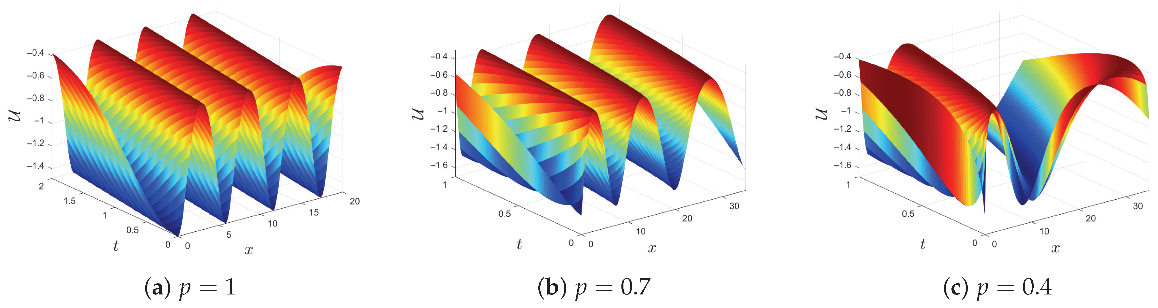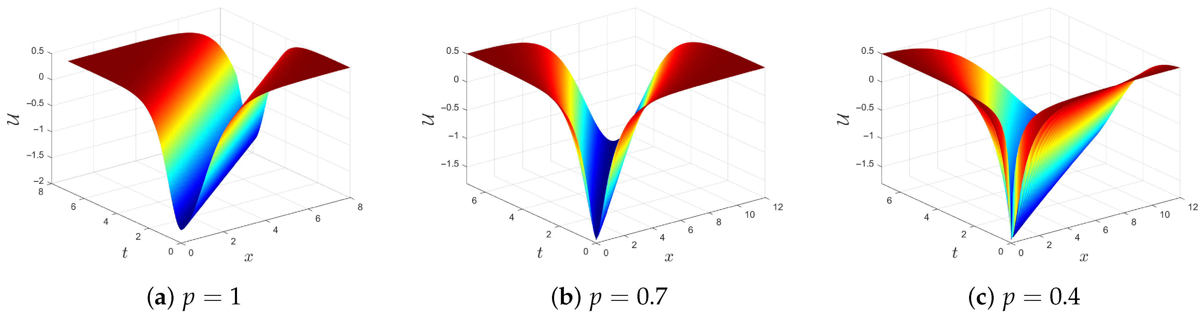 In this subsection, we show the impact of the fractional order p by varying it through the interval . It is instructive to compare the present truncated M-fractional model with the classical case (). In the classical limit , the model reduces to the standard weakly nonlinear dispersive wave equation, yielding fixed propagation regions and rigid wave profiles determined solely by the physical parameters. In contrast, the truncated M-fractional operator introduces a continuous fractional order that allows smooth deformation of the wave structure.