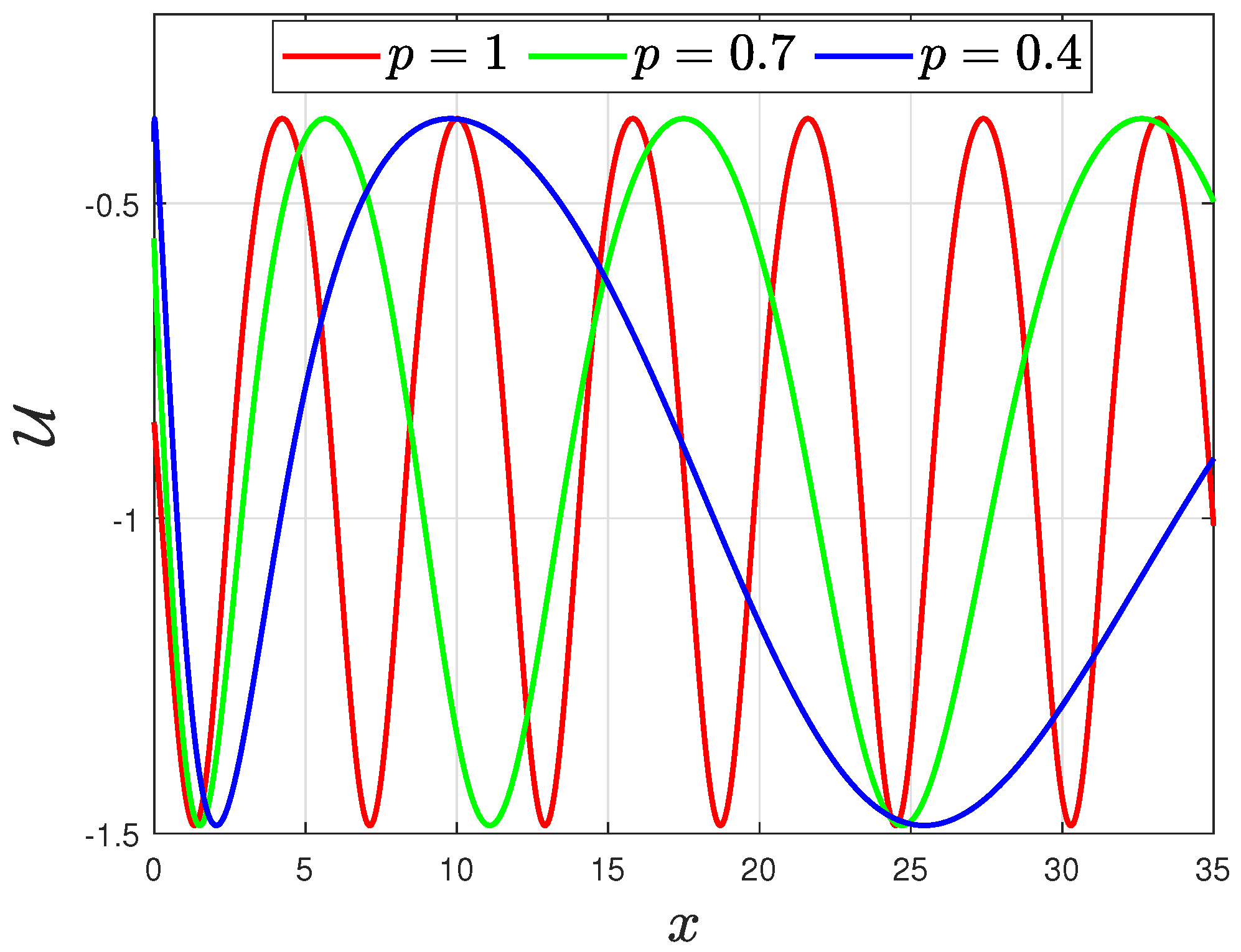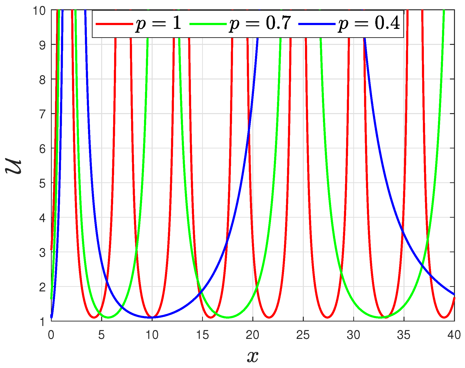 p decreases from 1 toward zero, the wave becomes wider and gradually, loses its regular wave shapes.