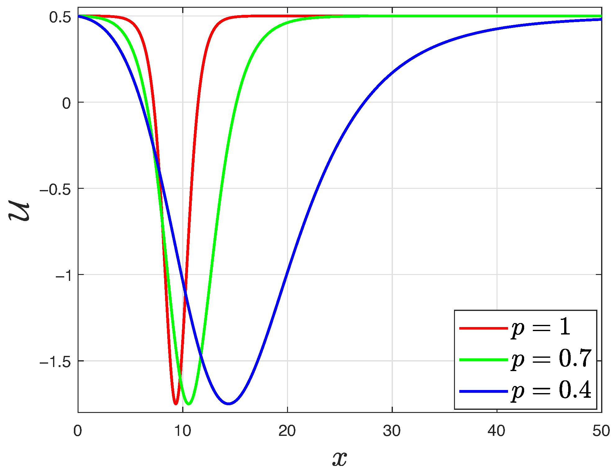 p moves further from 1 and gets closer to zero, the width of the soliton wave increases while maintaining a constant wave height.