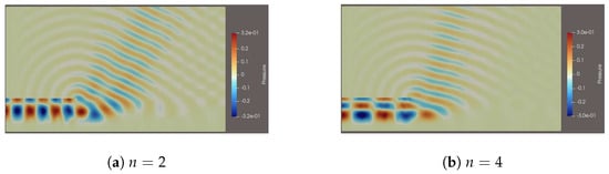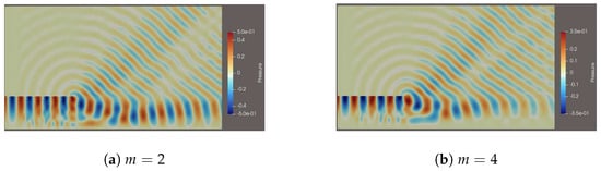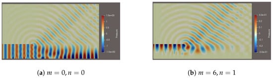 Figure 1, Figure 2, Figure 3 and Figure 4 show the simulation results of noise under different parameters, the units of x and y coordinates are m, and the cross-section of the pipeline wall is not displayed. The results demonstrate that the acoustic wave attenuation is zero in the process of propagation from the outer boundary of the calculation domain to the outer boundary of the buffer layer. Further, there is no reflection at the boundary of the calculation domain, which indicates that the absorbing boundary condition in this paper successfully avoids the numerical pseudo waves reflected from the boundary. In addition, it can be seen that the sound propagation in the pipeline exhibits the following characteristics: (1) When the sound mode is , the sound only propagates in the axial direction in the form of plane wave, and there is no change in the sound distribution on the cross section of the pipeline. (2) In other acoustic modes, the sound not only changes along the axial direction of the pipe, but also has different distribution in the cross section. (3) As m increases, the propagation of sound waves in circumferential direction becomes more complex. (4) As n increases, the propagation of sound waves in radial direction becomes more complex. (5) As increases, the pulsation frequency of sound waves in both the circumferential and radial directions significantly increases. (6) The presence of the shear layer causes refraction of the plane wave near the layer, altering the direction of sound propagation.