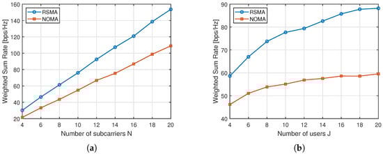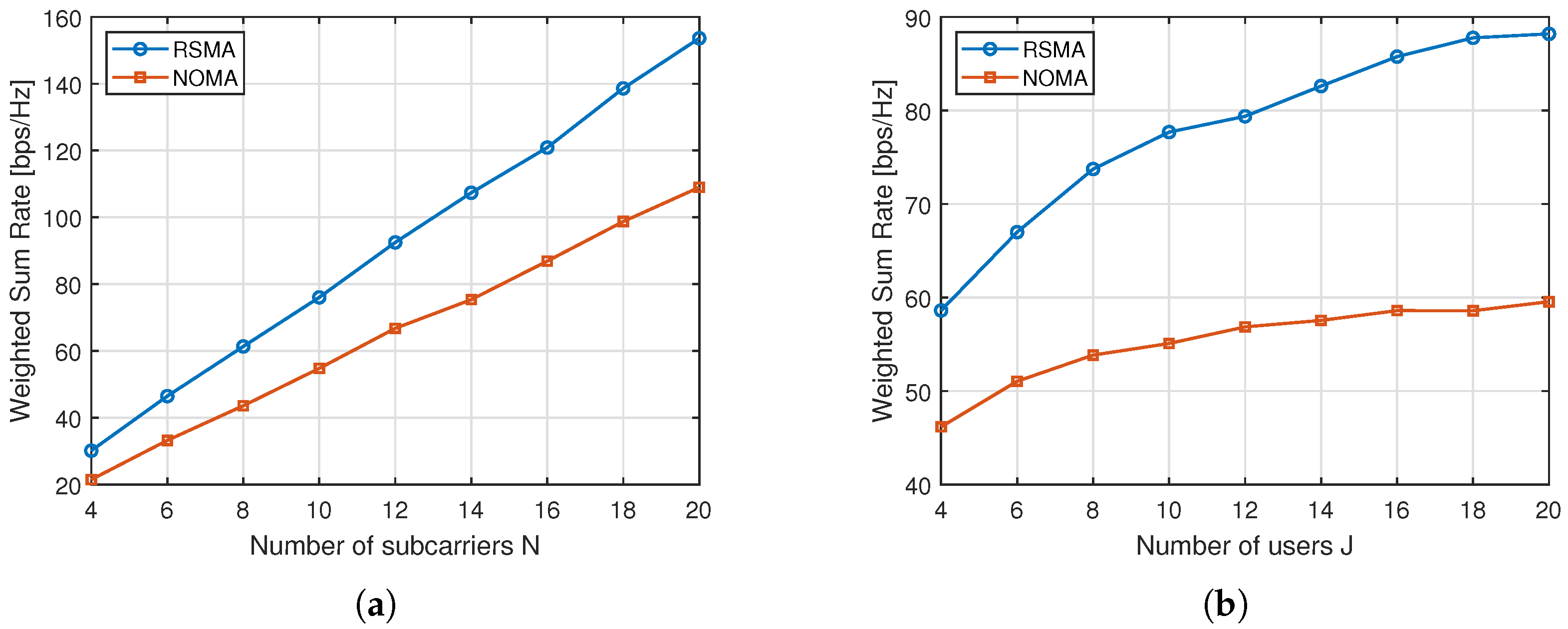 J increases, the performance gap becomes more pronounced, owing to the enhanced flexibility of RSMA in managing interference through joint private and common stream transmission. In contrast, despite employing optimal power allocation on each subcarrier, NOMA remains fundamentally limited by its two-user superposition and successive interference cancellation (SIC) structure, which restricts its ability to flexibly manage multiuser interference.