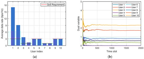 Figure 3 show that all users meet their long-term QoS requirements in both scenarios. Users closer to the BS achieve higher long-term rates due to stronger channels, whereas distant users obtain lower rates. The dual update mechanism automatically compensates for this disparity by increasing the