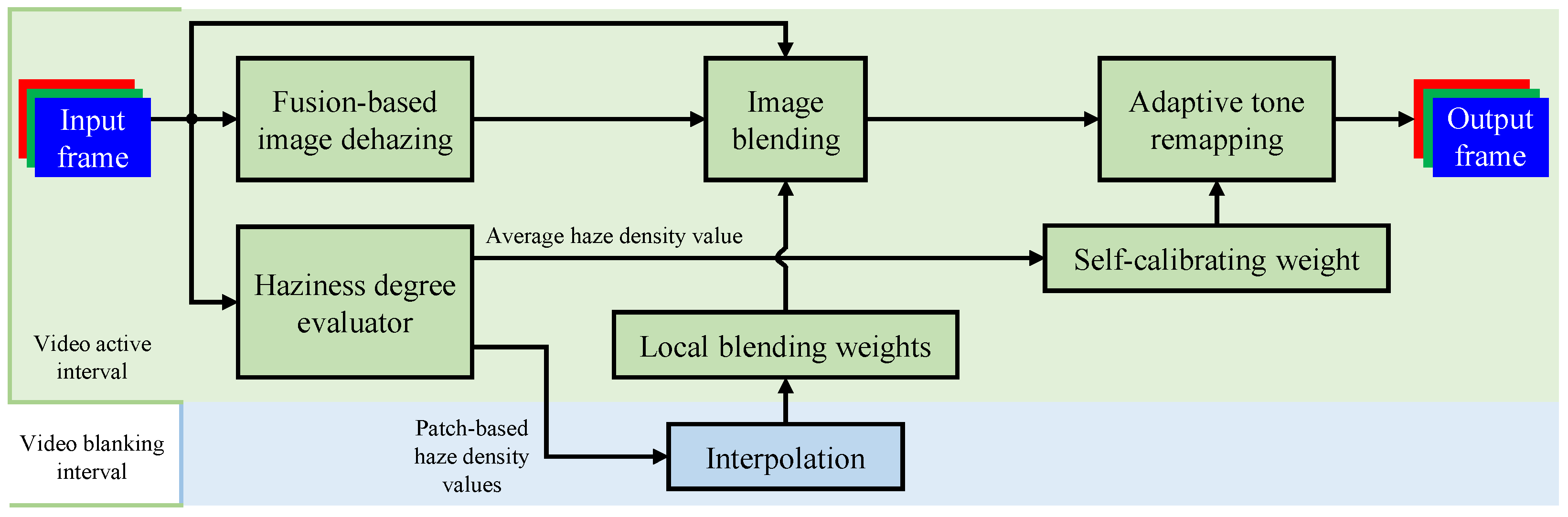 Figure 1, the method comprises seven modules. The fusion-based dehazing module generates an initial dehazed estimate of the input image. The haziness-degree evaluator computes pixel-wise haze density and derives both patch-based and average haze values. The interpolation module low-pass filters and upsamples the patch-based densities to produce a smooth spatial haze field. This field is then used by the local-blending-weight module to compute fusion weights. The image-blending module fuses the input with its dehazed estimate using these weights. In parallel, the average haze density feeds the self-calibrating-weight module, which controls the adaptive tone-remapping module. This final module enhances the fused image while preventing artifacts such as undershoot, over-enhancement, and color distortion.