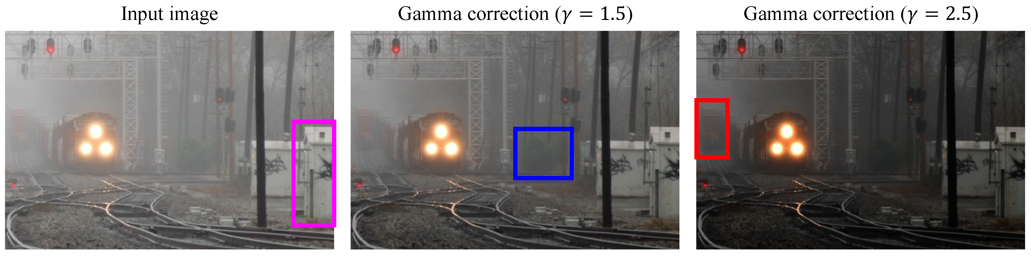 ) reveals scene structures otherwise obscured by veiling light; objects become increasingly discernible in these darker variants (highlighted in pink, blue, and red rectangles). This observation motivates the generation of multiple under-exposed versions of the input and their fusion to enhance scene visibility.