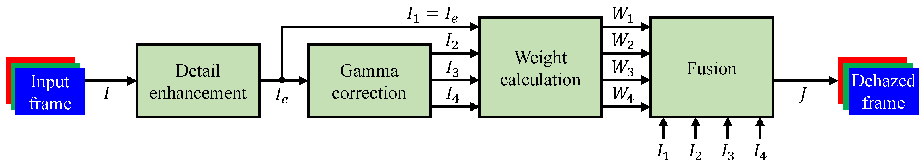 J), combining the enhanced local contrast of the under-exposed variants with the original color fidelity. This process avoids explicit transmission estimation, enabling a lightweight and fully model-free solution well-suited for parallel processing.