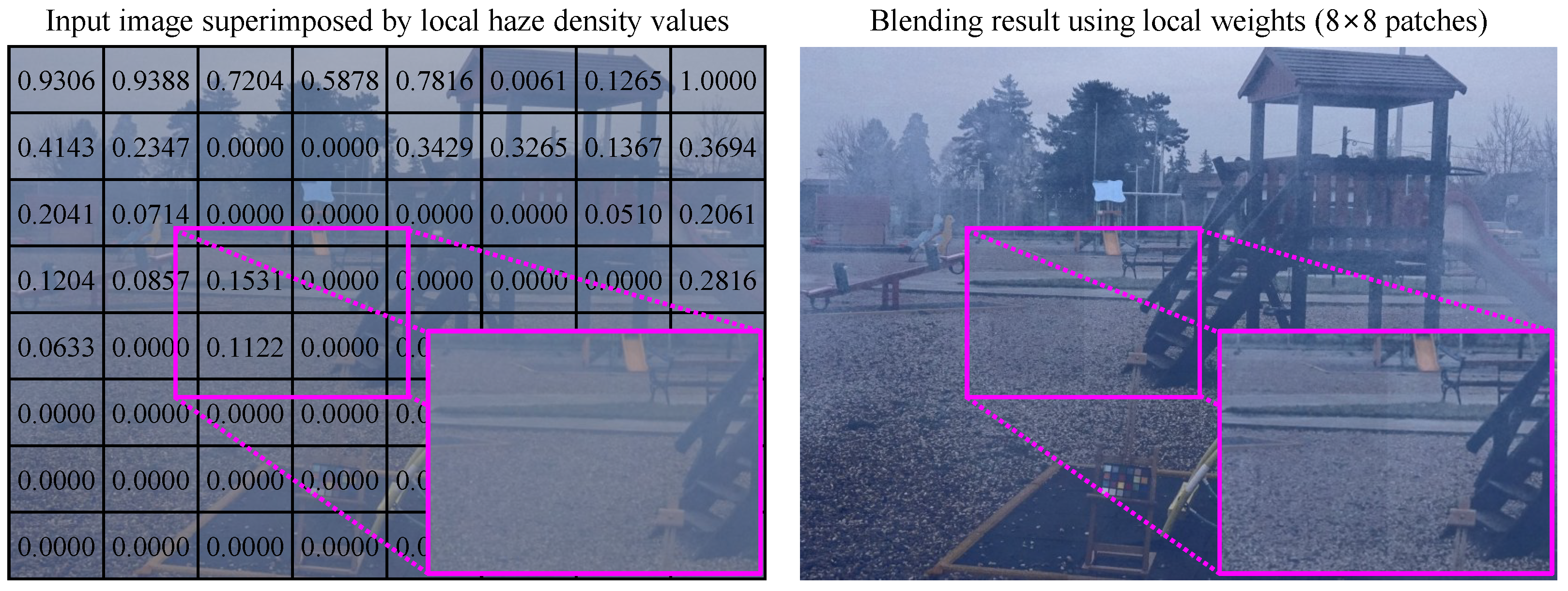 Figure 4 visualizes the patch-based haze densities, where the highlighted region shows abrupt transitions from
