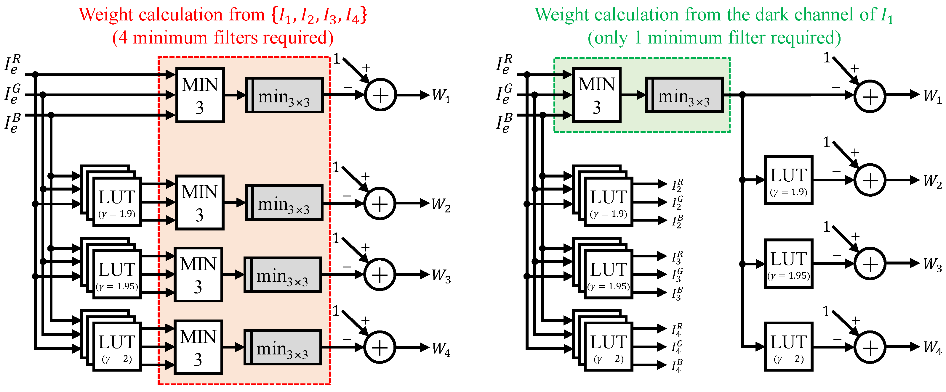 Gamma correction is applied to the detail-enhanced image () to simulate multiple under-exposure levels. In principle, increasing the number of gamma-adjusted variants can further improve dehazing quality by providing richer visibility cues. However, each additional variant requires an extra look-up table (LUT), dark-channel computation, and fusion branch, causing hardware resource usage to grow exponentially. Considering that dehazing serves as a pre-processing stage in a larger vision system, a balance between algorithmic performance and hardware efficiency is essential.
