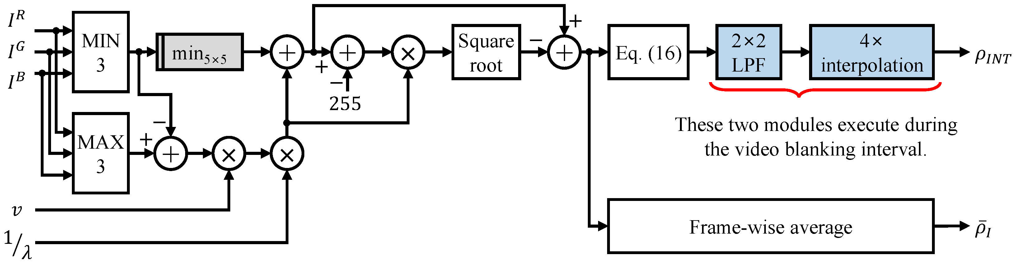 Figure 1) process streaming pixels continuously, while the interpolation module (pale blue) operates during blanking periods, leveraging temporal reuse to maintain throughput. This organization matches the model-free design of the proposed framework and facilitates efficient hardware realization.