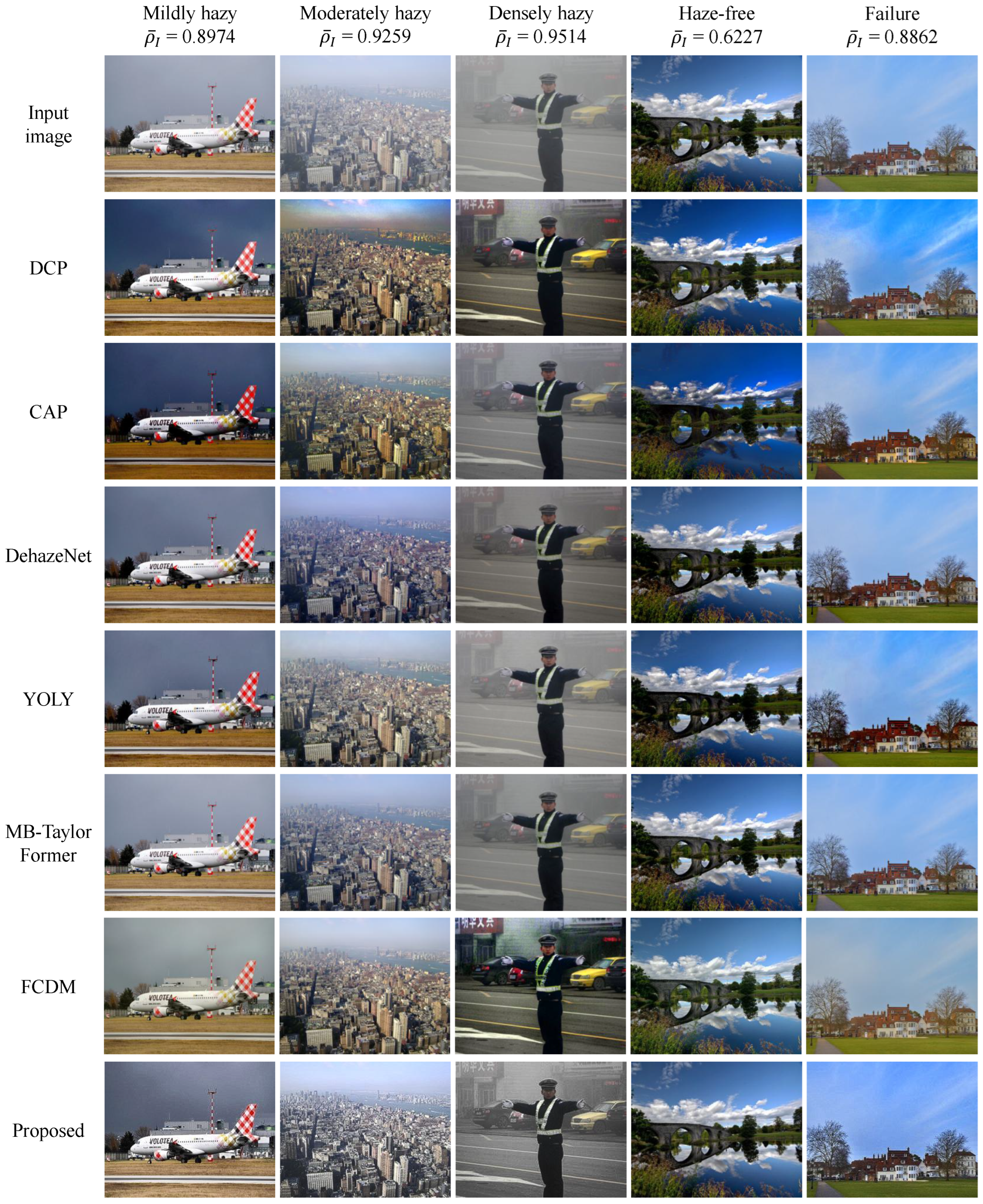 Figure 12 shows the restoration results across diverse haze conditions, including mild, moderate, and dense haze, haze-free scenes, and challenging failure cases.