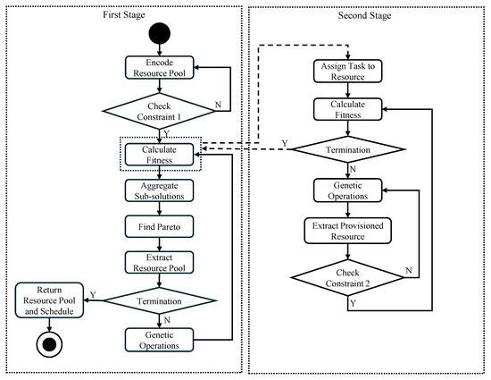We propose a two-stage optimization method to address the problem of elastic resource provisioning and scheduling, which involves refining S to meet specified objectives. This method is termed the Two-Stage Genetic-Based Resource Provisioning and Scheduling (2SG-PS). The first stage focuses on refining the resource pool, while the second stage concentrates on optimizing the schedule based on the resource pool established in the first stage. Given the complexity of the problem, a genetic-based approach is applied for optimization. The overall method is illustrated in the flowchart shown in Figure 1. We introduce novel encoding schemes and a new selection process in the first stage.