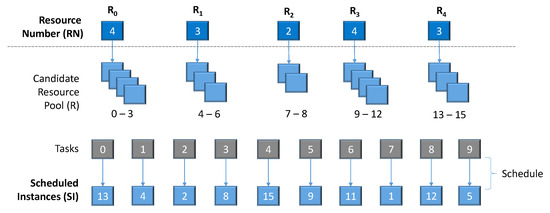 The first-stage encoding scheme focuses on optimizing the number of resource instances, denoted by , for each resource type. This stage involves selecting a potential number of resource instances, yet the actual provisioned resource instances depend on the following task schedule. Each individual in the genetic algorithm for potential resource instance count is represented by a vector of size M and encoded as integers. The range of values possible for each resource type is constrained by . The constraint on the total number of provisioned resource instances is not checked during the first stage. The initial stage proposes a pool of resources, with the actual provisioned resources potentially being less than or equal to this pool. Therefore, the second resource constraint is assessed only in the subsequent stage. Figure 2 exemplifies the proposed encoding scheme. In this scheme, the first layer presents the resource number , where five types of resources are outlined, namely, to . It encodes only the quantity of instances for each resource type; for instance, four instances for , three instances for , etc.