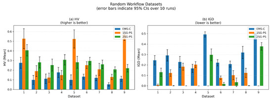 Table 5 reports the exact mean and standard deviation of HV and IGD over 10 independent runs. To statistically validate the HV differences, Table 7 presents HV-based pairwise comparisons using Wilcoxon signed-rank tests and Cliff’s delta effect sizes. Against EMS-C, 2SG-PS achieves 9 wins out of 9 comparisons with all p-values equal to 0.002 and large effect sizes (). Against 1SG-PS, 2SG-PS wins 6 out of 9 comparisons; the 3 losses occur on datasets 1, 5, and 9 where 1SG-PS performs better, consistent with the observation that 2SG-PS is less effective on low-parallelism workflows. We note that datasets with near-zero RDI values correspond to cases where win/tie/loss counts and effect sizes indicate weak or inconsistent differences, whereas larger-magnitude RDI values align with consistent wins and larger effect sizes for 2SG-PS.