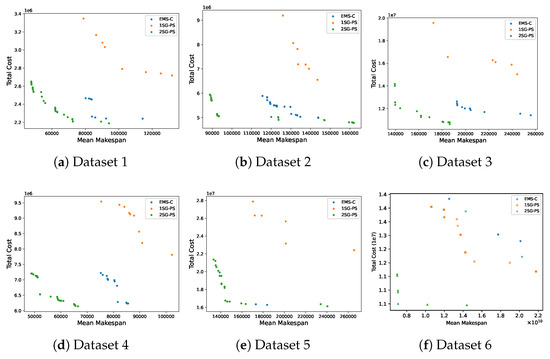 1SG-PS optimizes the resource pool and scheduling concurrently, where both optimizations are interdependent. Therefore, it may hinder convergence, as changing the resource pool may cause the scheduling to be no longer optimized. This is observed in the large gap in the Pareto fronts between 1SG-PS and 2SG-PS in Figure 7. On the other hand, instead of directly optimizing resource provisioning, EMS-C optimizes the instance and resource types to execute tasks, and the number of resource instances is only established based on the instance and type. EMS-C uses a co-evolutionary approach in the crossover operation, i.e., the same crossover point is used for resource instance and type. This limits the diversity of solutions for EMS-C, as seen in Figure 8.