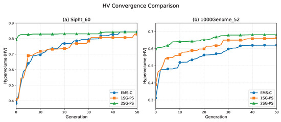 To illustrate the search dynamics and convergence behavior on real workflow applications, Figure 9 presents the HV convergence curves over generations for two representative scientific workflow datasets (Sipht_60 and 1000Genome_52). The results show that 2SG-PS achieves rapid early improvement and maintains a stable HV plateau in later generations, benefiting from the two-stage decomposition and caching of intermediate results.