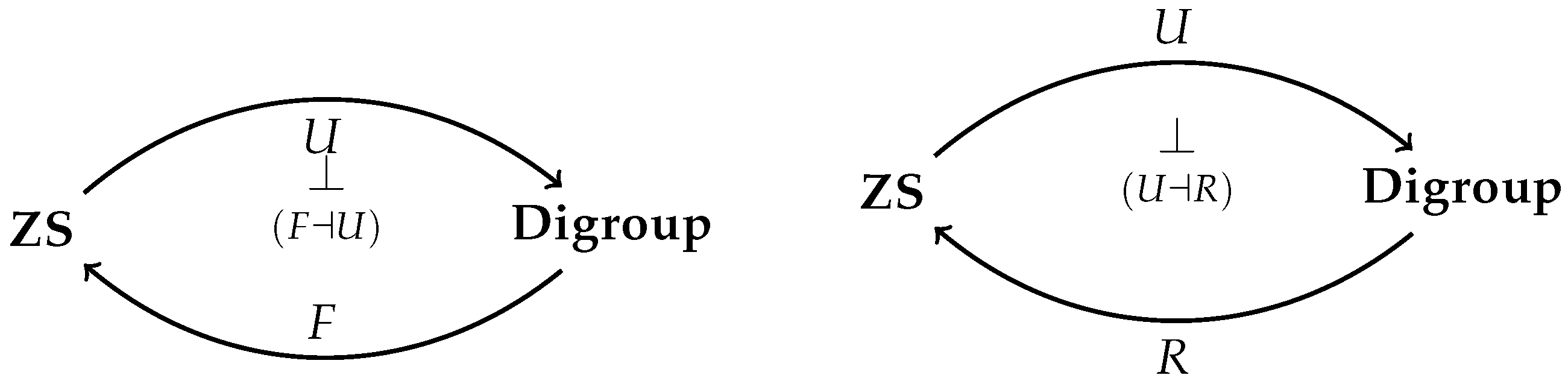 - We apply Beck’s monadicity theorem ([12], Chapter 6, Theorem 1). The functor U reflects isomorphisms because if in is such that is an isomorphism in , then f is bijective and preserves all structure maps (actions and connector). Consequently, also preserves the structure, so f is an isomorphism in . To show that U creates coequalizers for reflexive pairs, let be a reflexive pair in . Consider their coequalizer in . Since the Zappa–Szép axioms are equational, the digroup Q carries a unique Zappa-–Szép structure that makes q a homomorphism in . Specifically, the actions and connector on Q are induced by those on B via q, and the compatibility conditions are preserved because they are equations. Thus, q is the coequalizer in . A dual argument shows that U creates equalizers for coreflexive pairs. Therefore, the adjunction is monadic. By symmetry, the adjunction is comonadic.