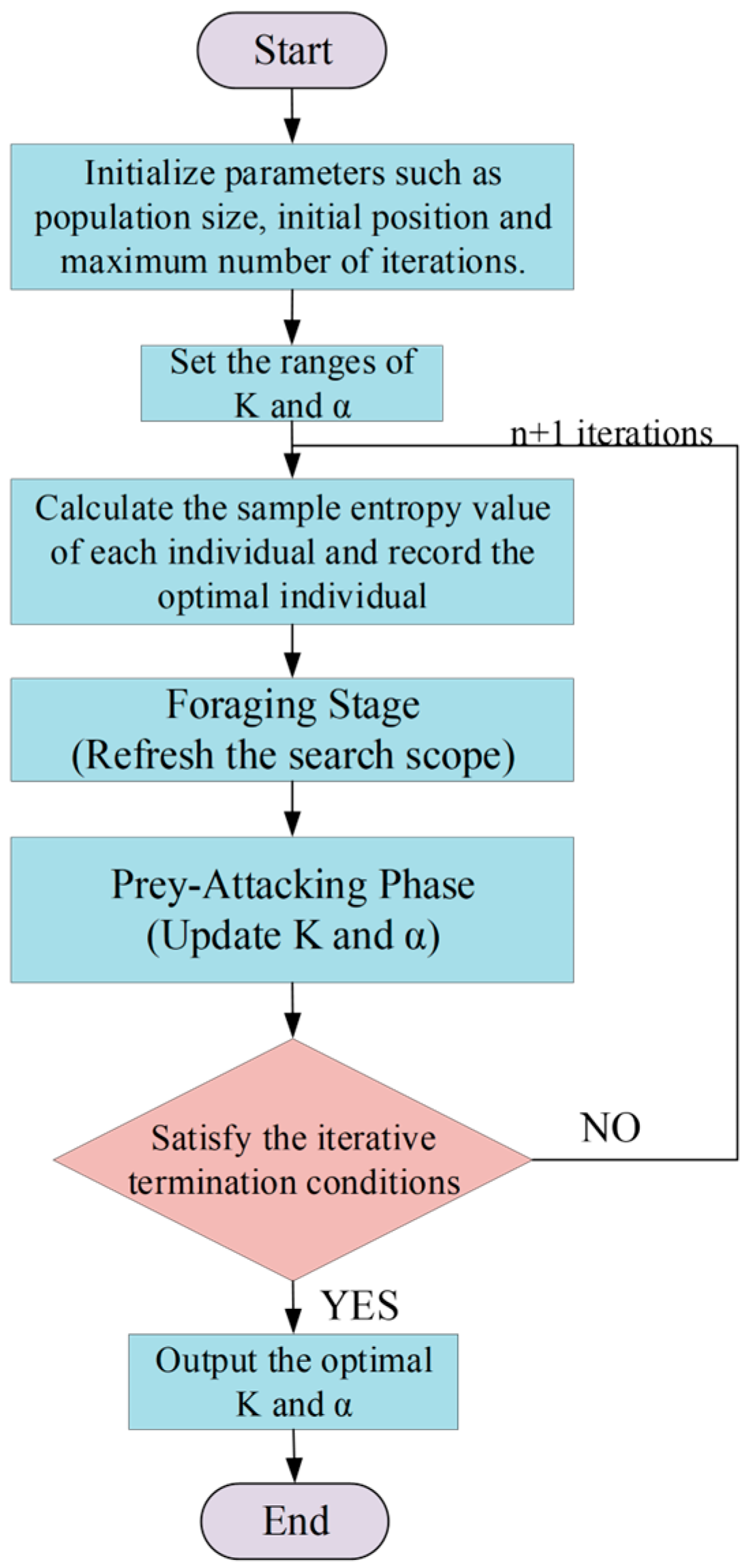 - Initialization: Initialize the population using Equations (5) and (6). Set population size n = 40, dimension dim = 2, where j = 1 and j = 2 represent and respectively. Set the maximum iteration count T = 60, with K ranging from [4, 10] and α ranging from [100, 3000];
