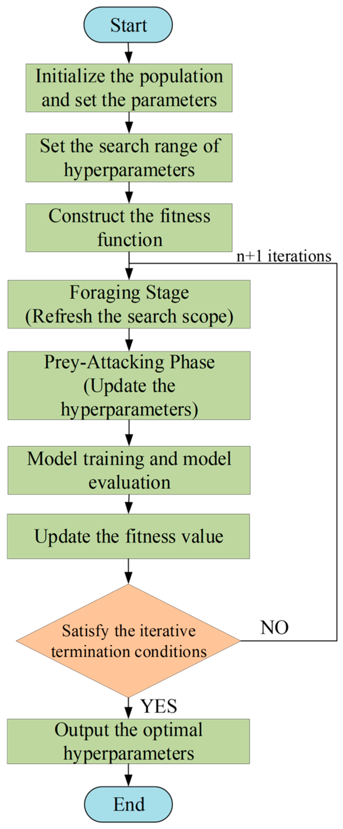 - During the prey attack phase, based on Equations (9) and (10), perform fine-grained development around the current optimal solution and update the model hyperparameters;