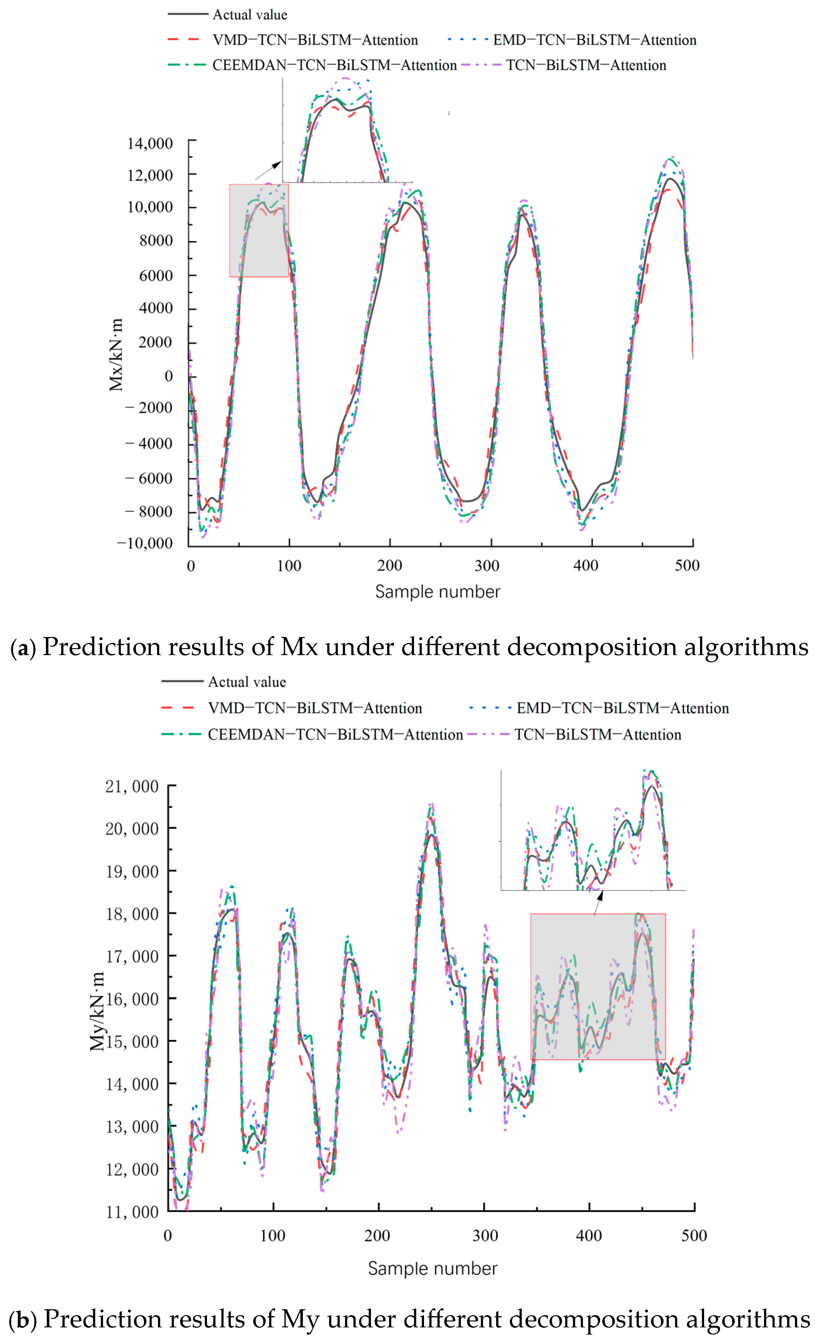 - The VMD-TCN-BiLSTM-Attention model has better performance compared with the TCN-Bi LSTM-Attention model. It shows that the VMD algorithm can overcome the shortcomings of high volatility and non-stationarity of the original wind turbine sequence, which facilitates the prediction model to extract the hidden information in the data, and then improves the prediction accuracy of the blade root load of the wind turbines.