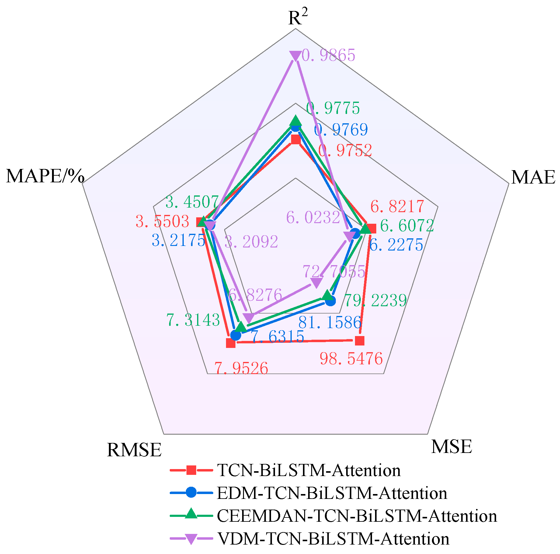 | PSO-VDM-TCN- BiLSTM-Attention | 0.9893 | 4.1326 | 49.8872 | 4.0319 | 2.7132 |